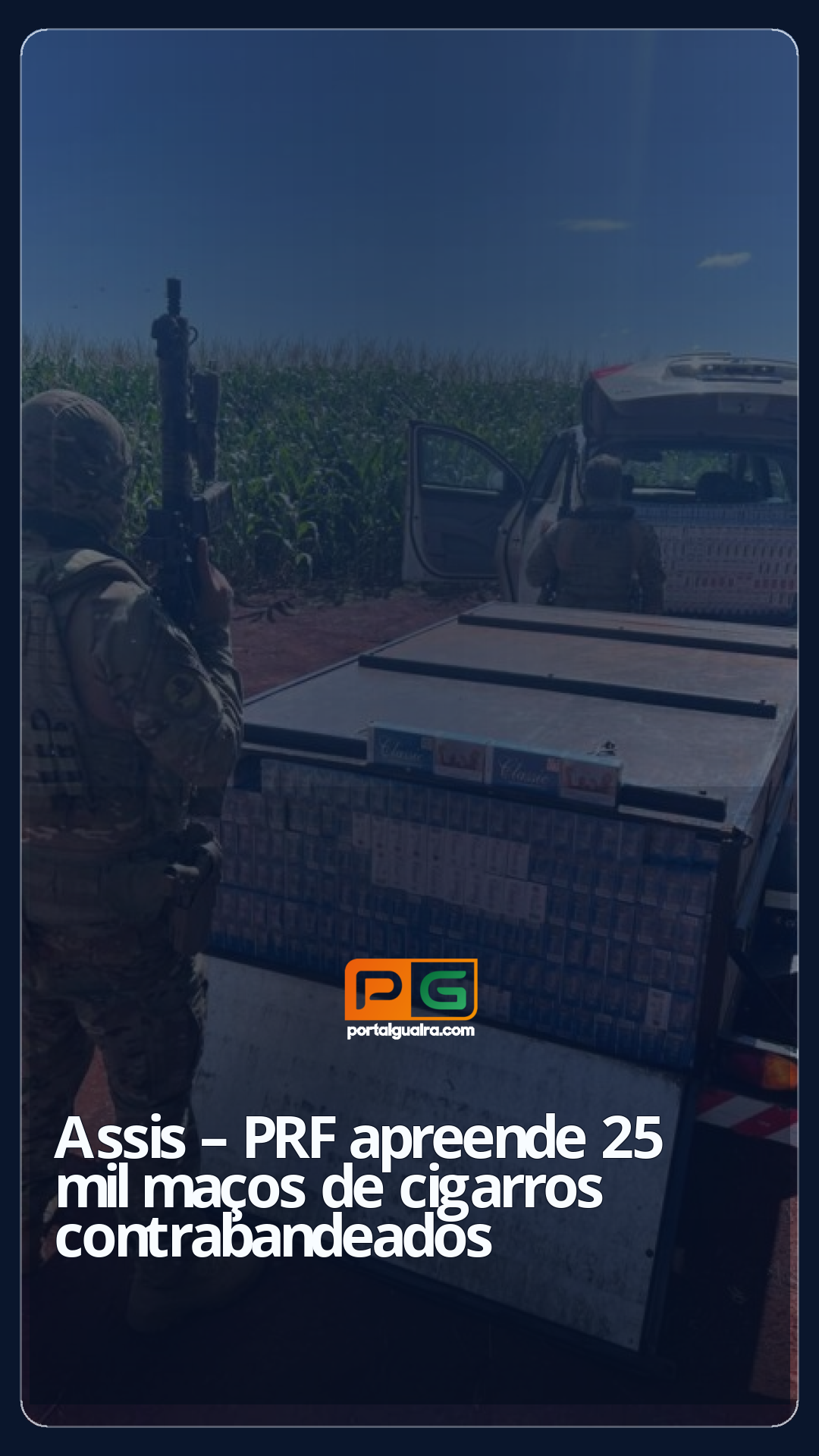 A apreensão aconteceu após os agentes perceberem que o condutor tentava esconder o veículo em meio a uma plantação de milho. Durante a abordagem, os policiais encontraram os cigarros na carreta e distribuídos por diversas partes do veículo, inclusive na região do motor.