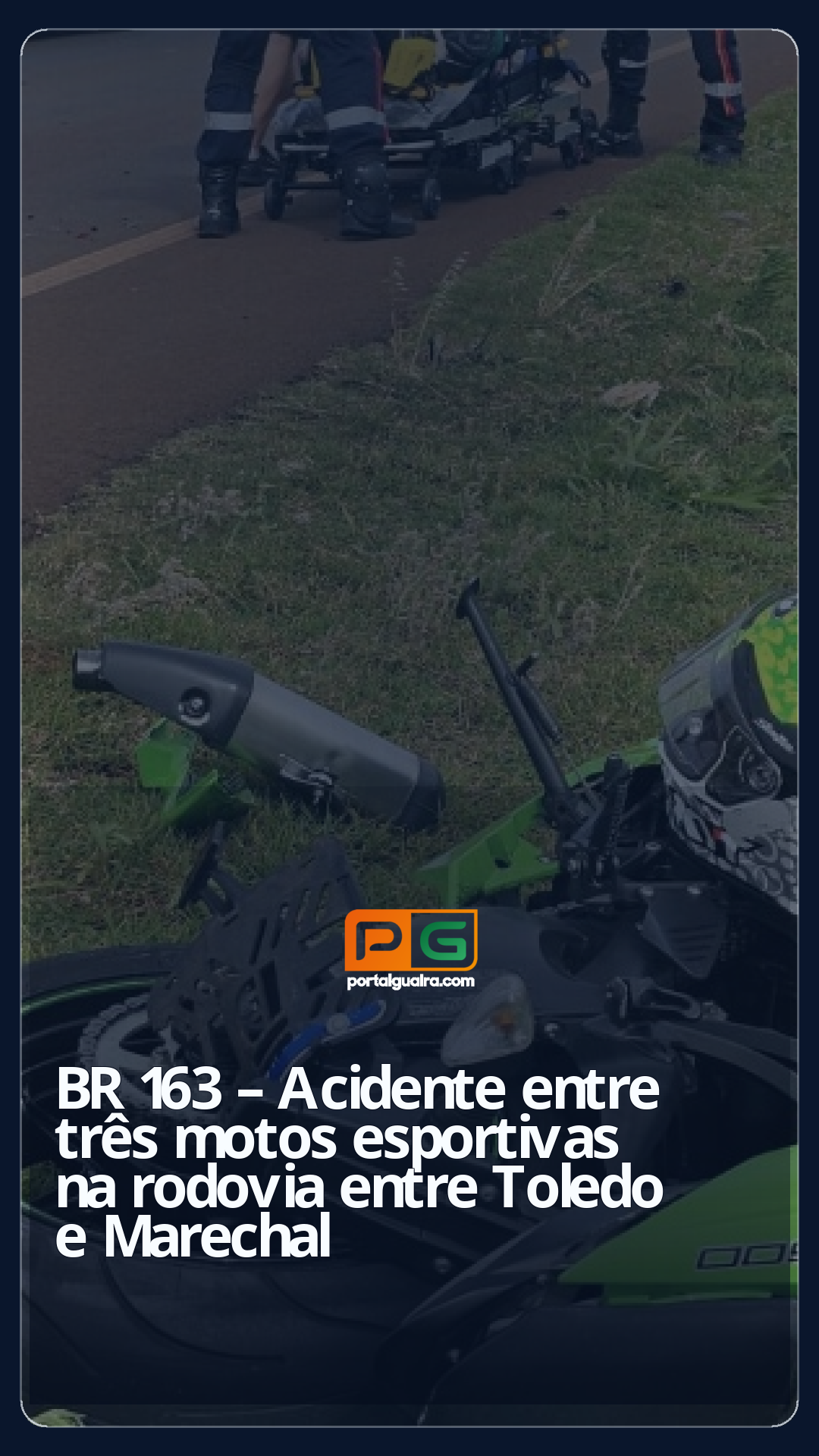 Um acidente envolvendo três motos de alta cilindrada foi registrado na BR-163, entre Toledo e Marechal Cândido Rondon, na tarde de sábado (25). A colisão foi nas proximidades do Posto Horizonte Azul e deixou três pilotos feridos, um deles em estado grave.