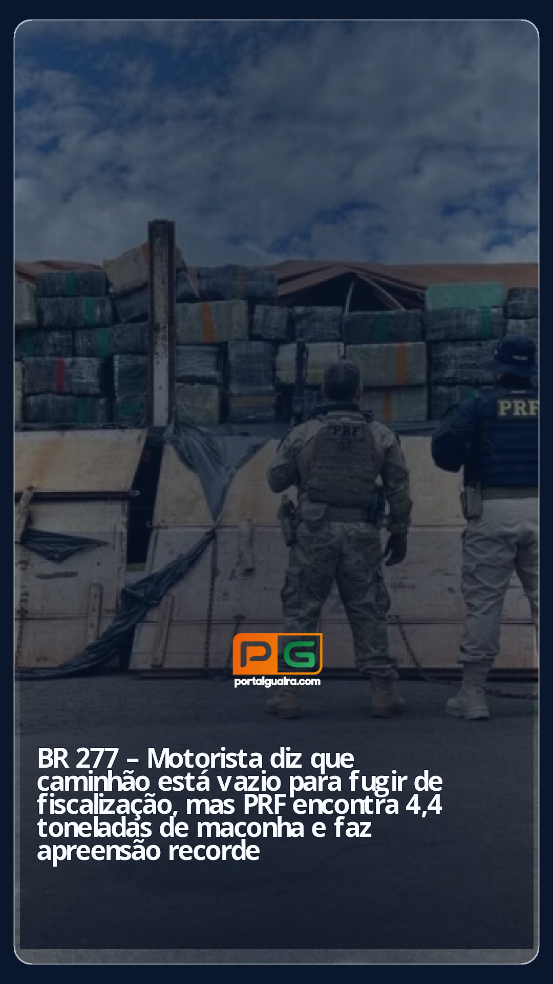 A Polícia Rodoviária Federal (PRF) encontrou 4,4 toneladas de maconha durante uma abordagem a um caminhão após o motorista do veículo alegar que a carroceria estava vazia para tentar fugir da fiscalização.