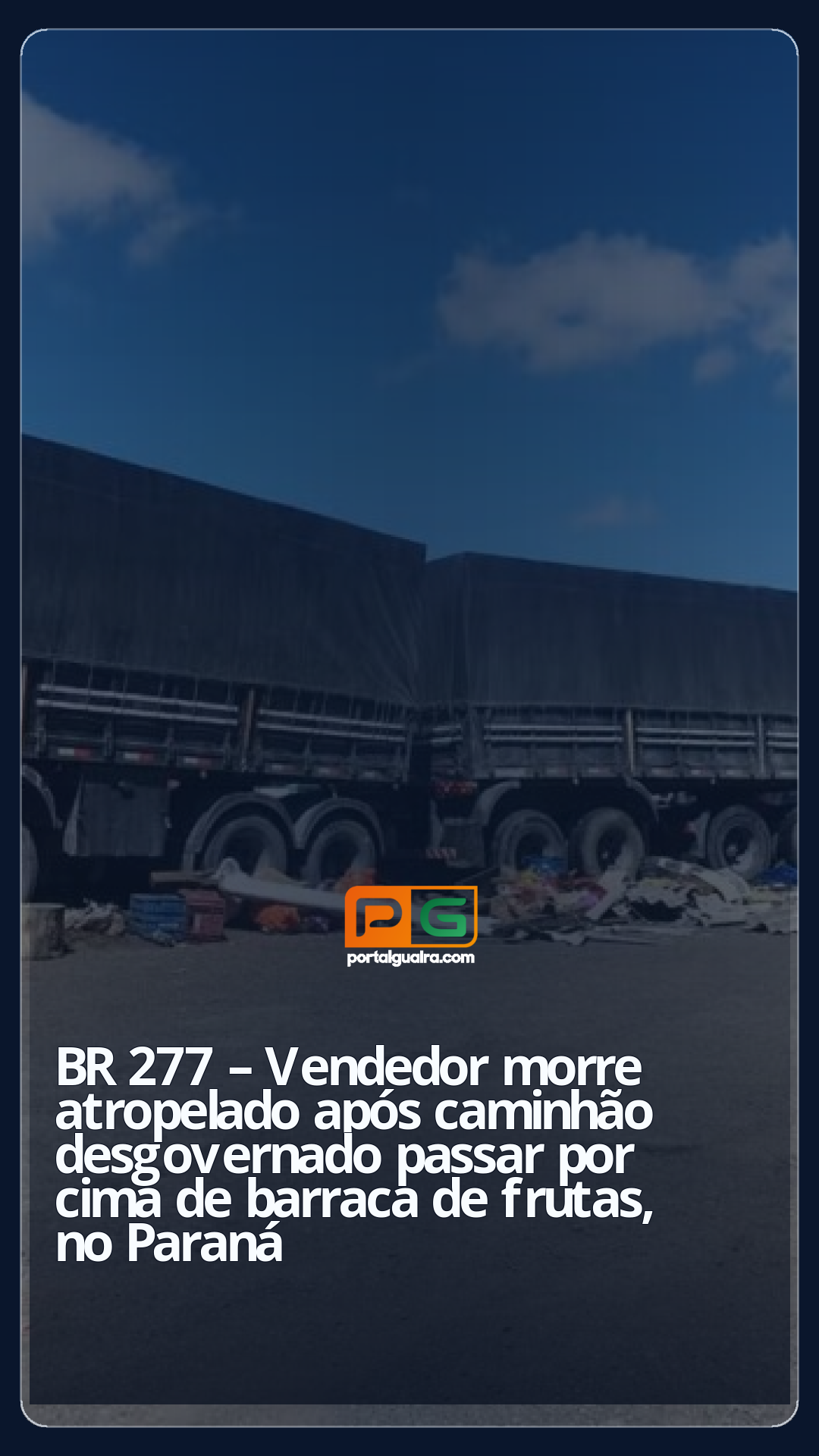 Um vendedor de 37 anos morreu atropelado depois que um caminhão desgovernado atingiu a barraca onde ele estava, perto do acostamento da BR-277, no distrito do Guará, em Guarapuava, região central do Paraná. O acidente aconteceu na manhã de domingo (31).