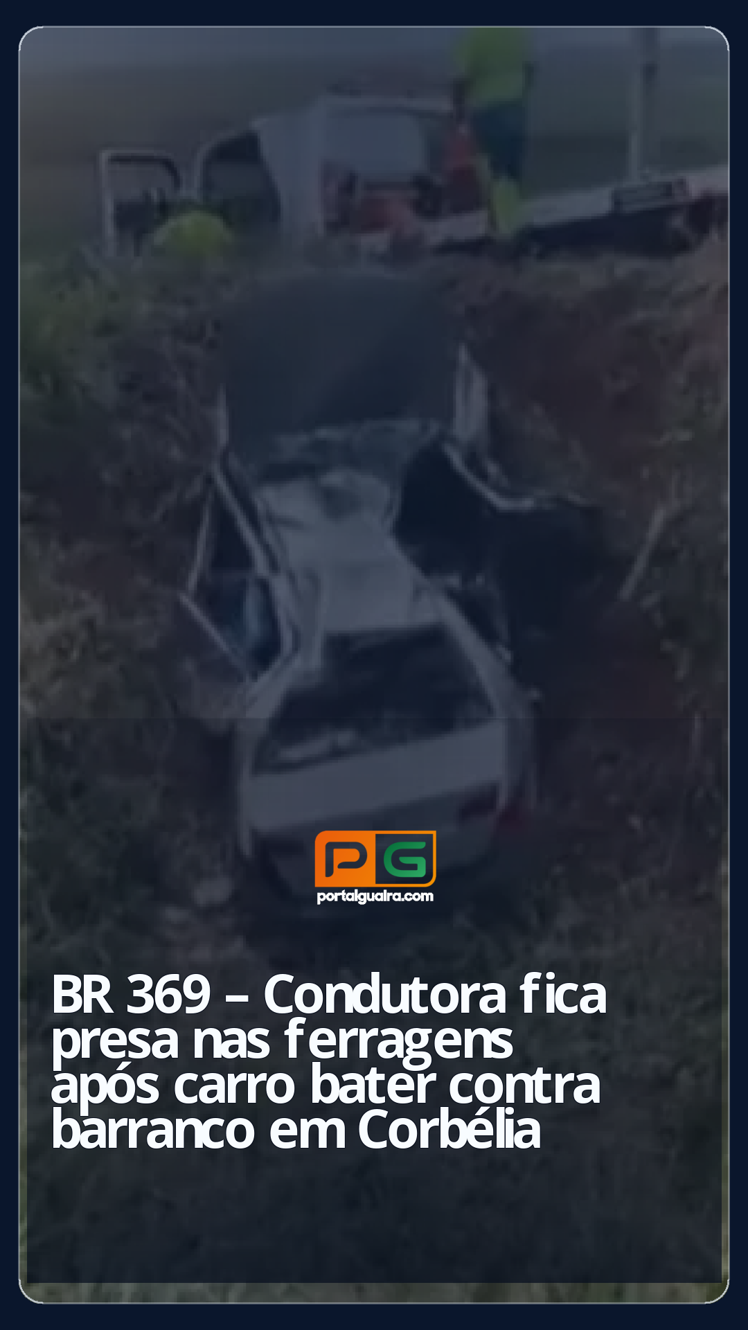 Um grave acidente foi registrado na tarde de sábado (06) na BR-369, nas proximidades do distrito da Penha, em Corbélia. Um veículo saiu da pista em uma curva, colidiu contra um barranco e capotou, deixando a condutora presa às ferragens.