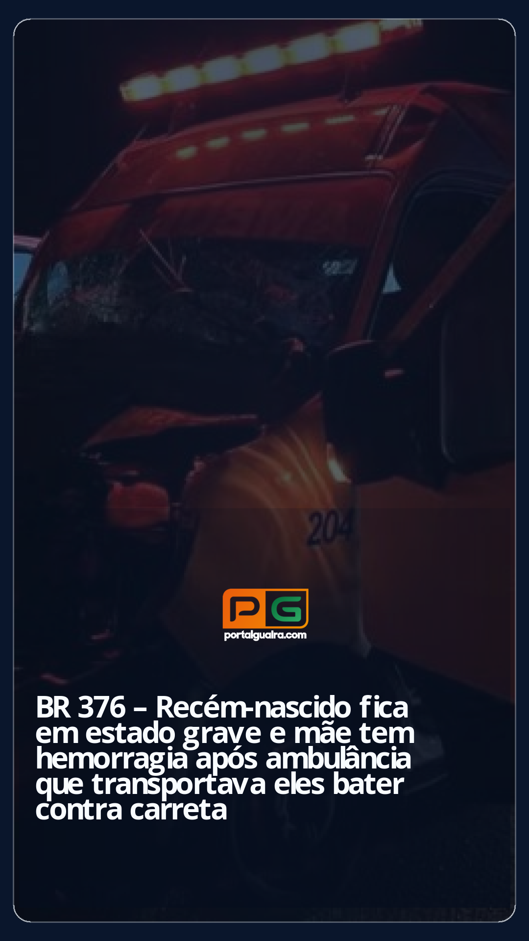 Um recém-nascido, de oito dias, está entre as vítimas de um acidente na BR-376, em Ponta Grossa, nos Campos Gerais do Paraná. A ambulância em que os dois estavam bateu contra a traseira de uma carreta, na noite de terça-feira (25).
