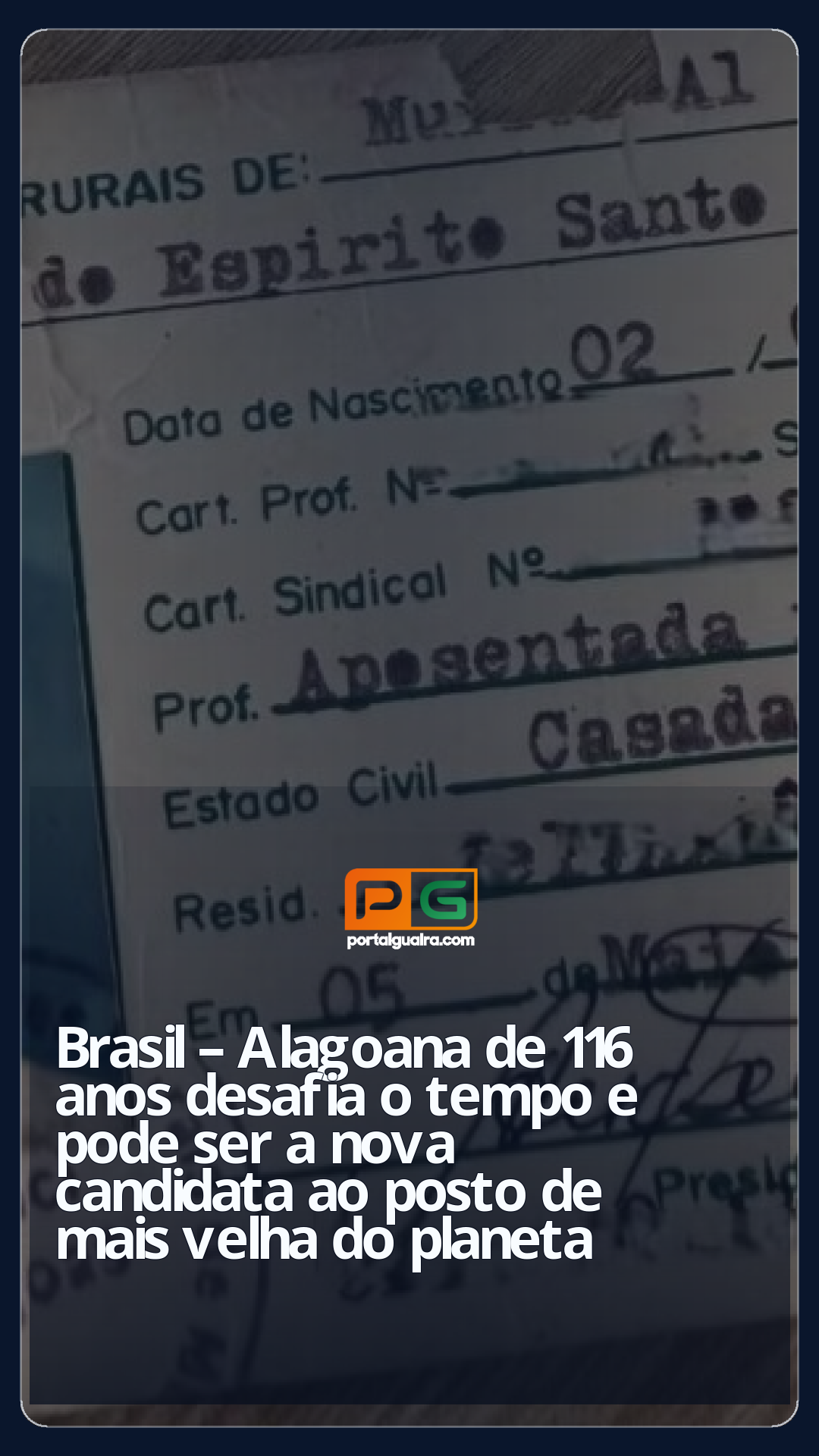Uma alagoana moradora de Rio Largo, na região metropolitana de Maceió, pode ser a uma das pessoas mais velhas do mundo. O registro do Sindicado dos Trabalhadores do Rurais e o RG, indicam que ela nasceu em 2 de fevereiro de 1909, o que significa que tem 116 anos, idade igual ao da atual recordista mundial, segundo dados da entidade internacional LongeviQuest.