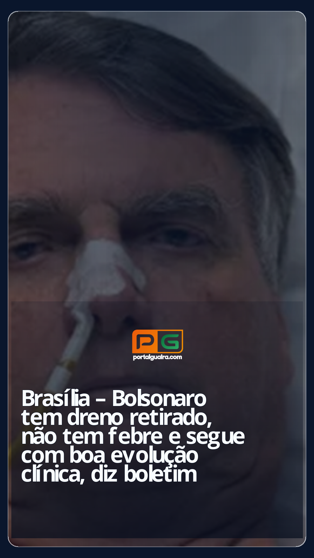 O ex-presidente Jair Bolsonaro permanece internado na UTI (Unidade de Terapia Intensiva), em um hospital particular de Brasília, na segunda-feira (21). De acordo com boletim, segue com boa evolução clínica, sem febre e pressão arterial controlada. Os médicos destacaram a retirada do dreno do abdômen e a realização da troca do curativo da cirurgia.