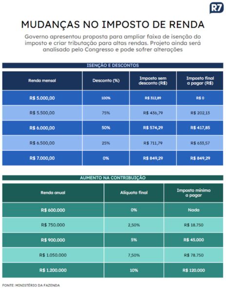 Ex-presidente da Câmara dos Deputados, Arthur Lira (PP-AL), que relata o projeto de lei que garante isenção do IR (Imposto de Renda) para quem ganha até R$ 5.000, aumentou o teto do desconto para quem ganha acima disso: o valor subiu de R$ 7.000, como previa o texto inicial enviado pelo governo, para R$ 7.350 mensais. Segundo Lira, essa mudança deve beneficiar 500 mil pessoas.