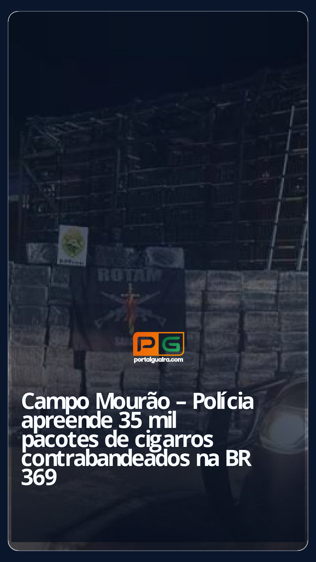 35 mil pacotes de cigarros contrabandeados do Paraguai foram apreendidos no sábado (14), na BR-369, em Campo Mourão. Equipes do Batalhão de Polícia de Fronteira, do 14º Batalhão da Polícia Militar e da Força Integrada de Combate ao Crime Organizado (FICCO/PR) realizaram a ação durante a Operação Protetor de Fronteiras e Divisas. O prejuízo estimado ao crime chega a R$ 2.510.000,00.