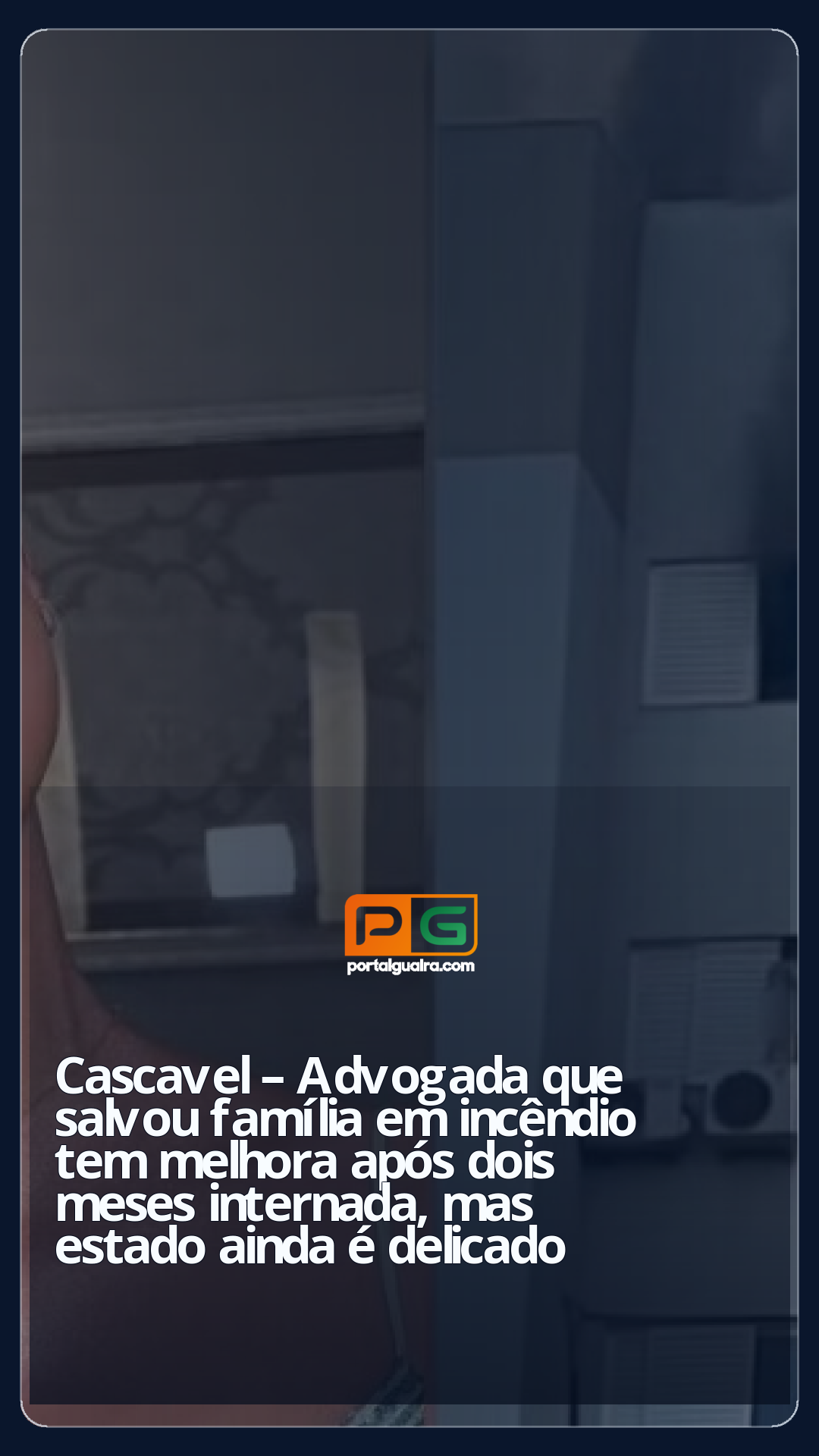 A família de Juliane Vieira afirma que o estado de saúde da advogada apresentou melhora, embora quadro ainda seja delicado. Juliane está internada desde o dia 15 de outubro, quando ficou gravemente ferida ao salvar a mãe e o primo de 4 anos durante um incêndio no prédio onde moravam, no centro de Cascavel.