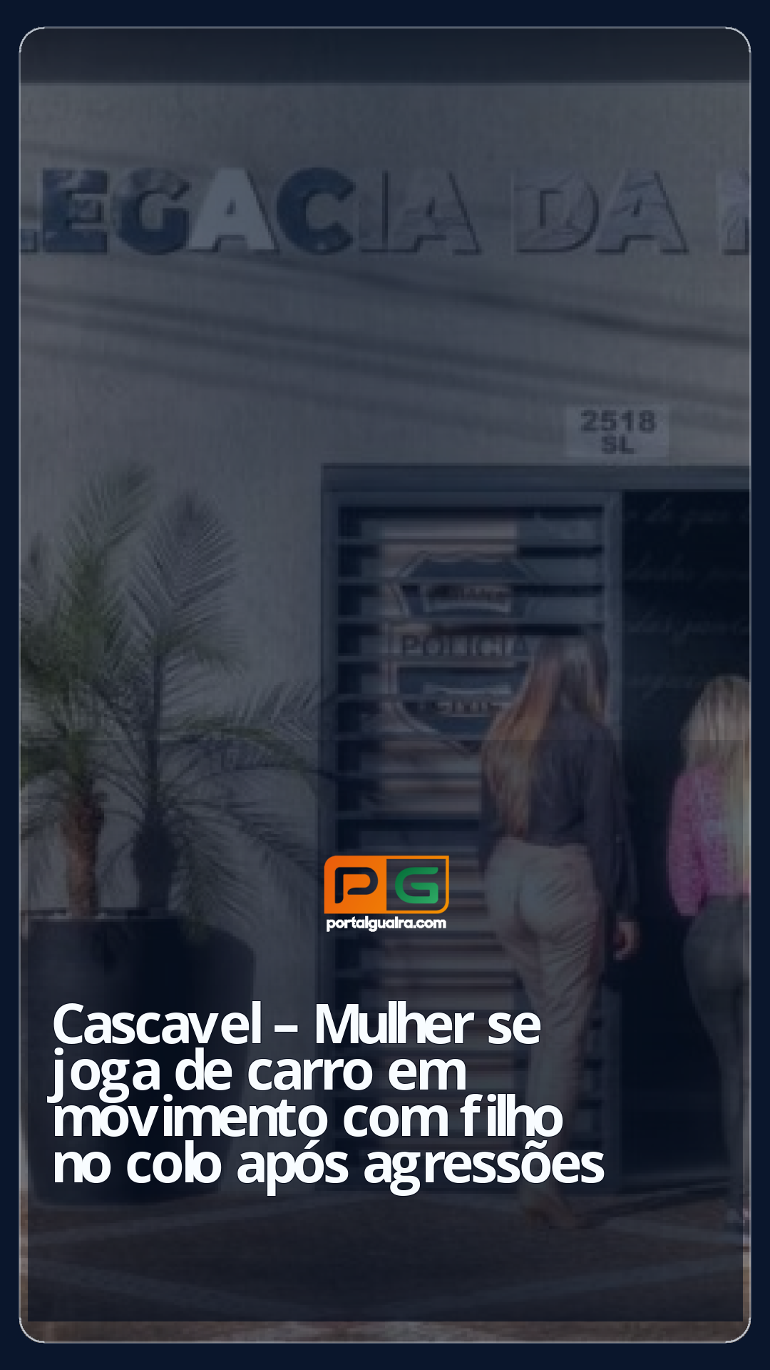 Uma jovem de 19 anos ficou ferida após pular de um carro em movimento com o filho de um ano no colo, em Cascavel. Segundo a Guarda Municipal, a mulher tentou escapar de agressões cometidas pelo namorado, de 20 anos, durante uma discussão dentro do veículo. A criança não se feriu.