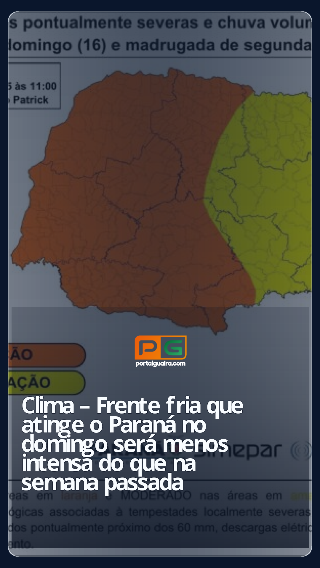 “Tempestades são esperadas sobre todo o Estado no domingo, com maior intensidade à tarde, principalmente no Oeste, em cidades próximas a Cascavel, Guarapuava e Umuarama. Embora as condições possam ser severas, as previsões não indicam a mesma intensidade da última passagem de frente, pois não há um sistema bem definido atuando, e sim a passagem de um cavado sobre o oceano”, explica Bianca de Ângelo, meteorologista do Simepar.