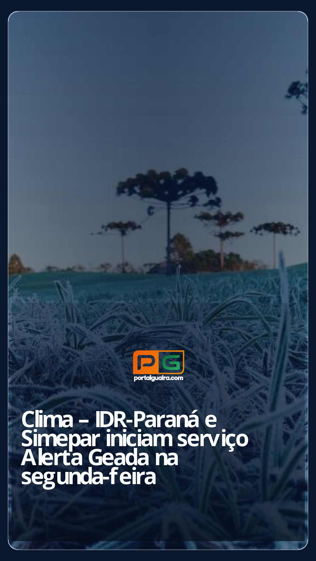 O IDR-Paraná (Instituto de Desenvolvimento Rural do Paraná — Iapar-Emater) e o Simepar (Sistema de Tecnologia e Monitoramento Ambiental do Paraná) iniciam nesta segunda-feira (5) a 31ª edição do Alerta Geada, serviço que opera de maio a setembro com o objetivo de avisar, com antecedência, produtores rurais sobre o risco de danos causados pelo frio.