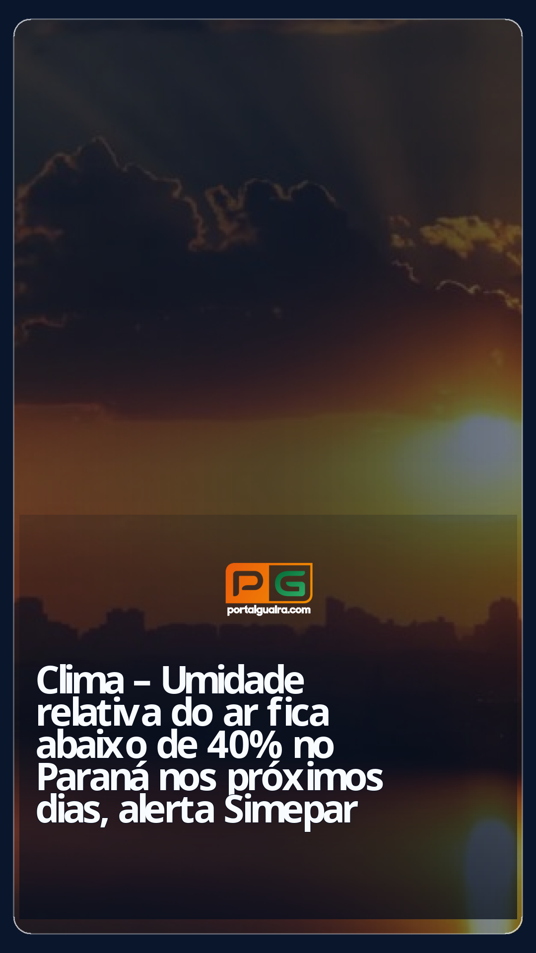 A partir desta sexta-feira (16), no Sudoeste, Oeste e Noroeste, até o Norte, os índices de umidade já devem ficar abaixo dos 40%, podendo chegar abaixo de 30% em algumas regiões. No fim de semana essa condição deve se espalhar para praticamente todo o Paraná, com exceção do Litoral.