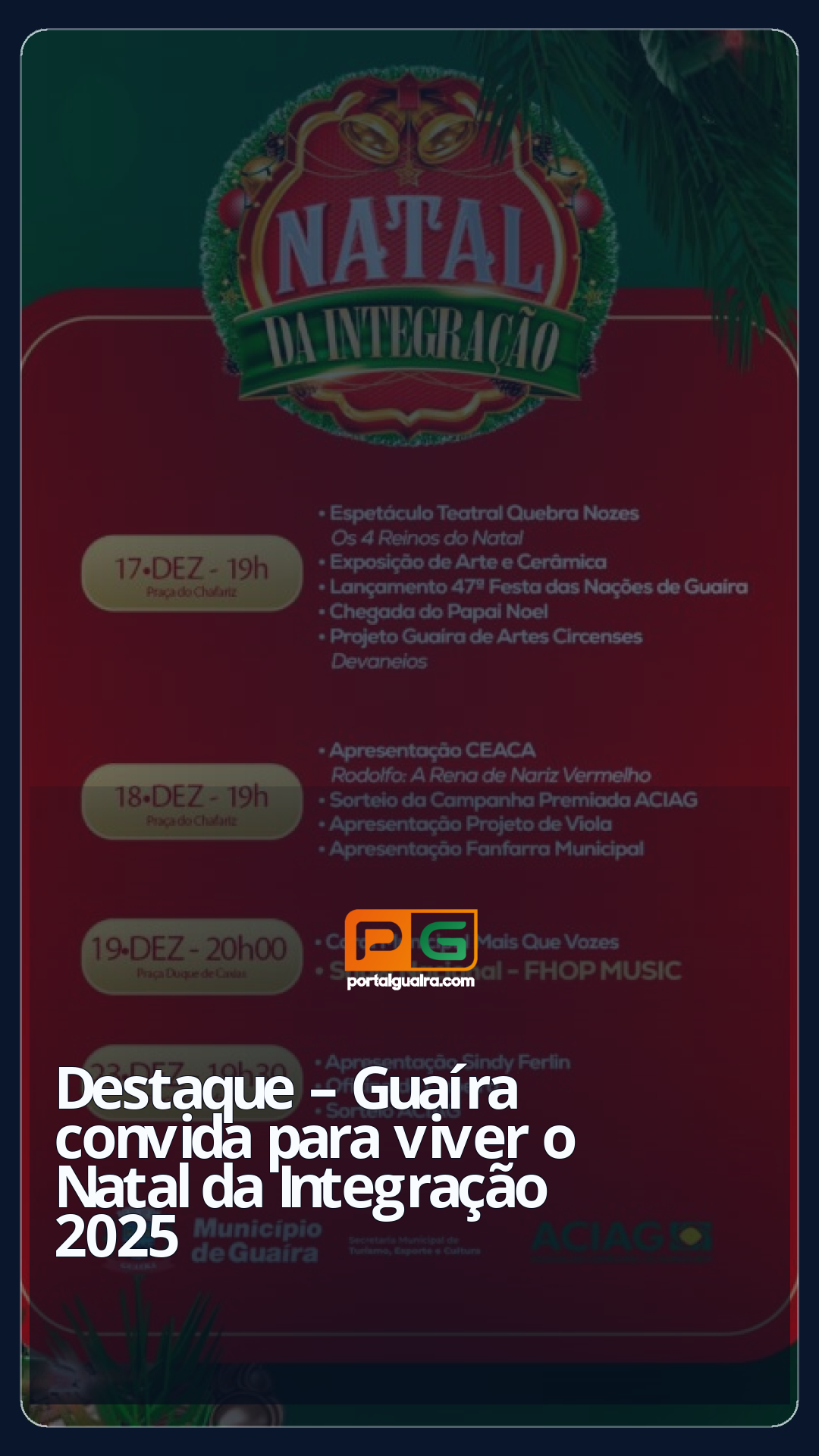 O Município de Guaíra apresenta a programação atualizada do Natal da Integração 2025, uma celebração que reafirma a tradição, a fé, a cultura e o encontro entre as pessoas. Realizado pela Diretoria de Cultura da Secretaria de Turismo, Esporte e Cultura, o evento integra o calendário oficial e retorna ao coração da cidade, iluminando o mês de dezembro com arte, emoção e convivência.