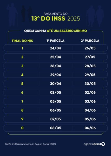 Cerca de 34,2 milhões de aposentados, pensionistas e beneficiários de auxílios do Instituto Nacional do Seguro Social (INSS) começaram a receber na segunda-feira (26) a segunda parcela do 13º. Feito de forma escalonada, conforme o dígito final do Número de Inscrição Social (NIS), o pagamento vai até 6 de junho.