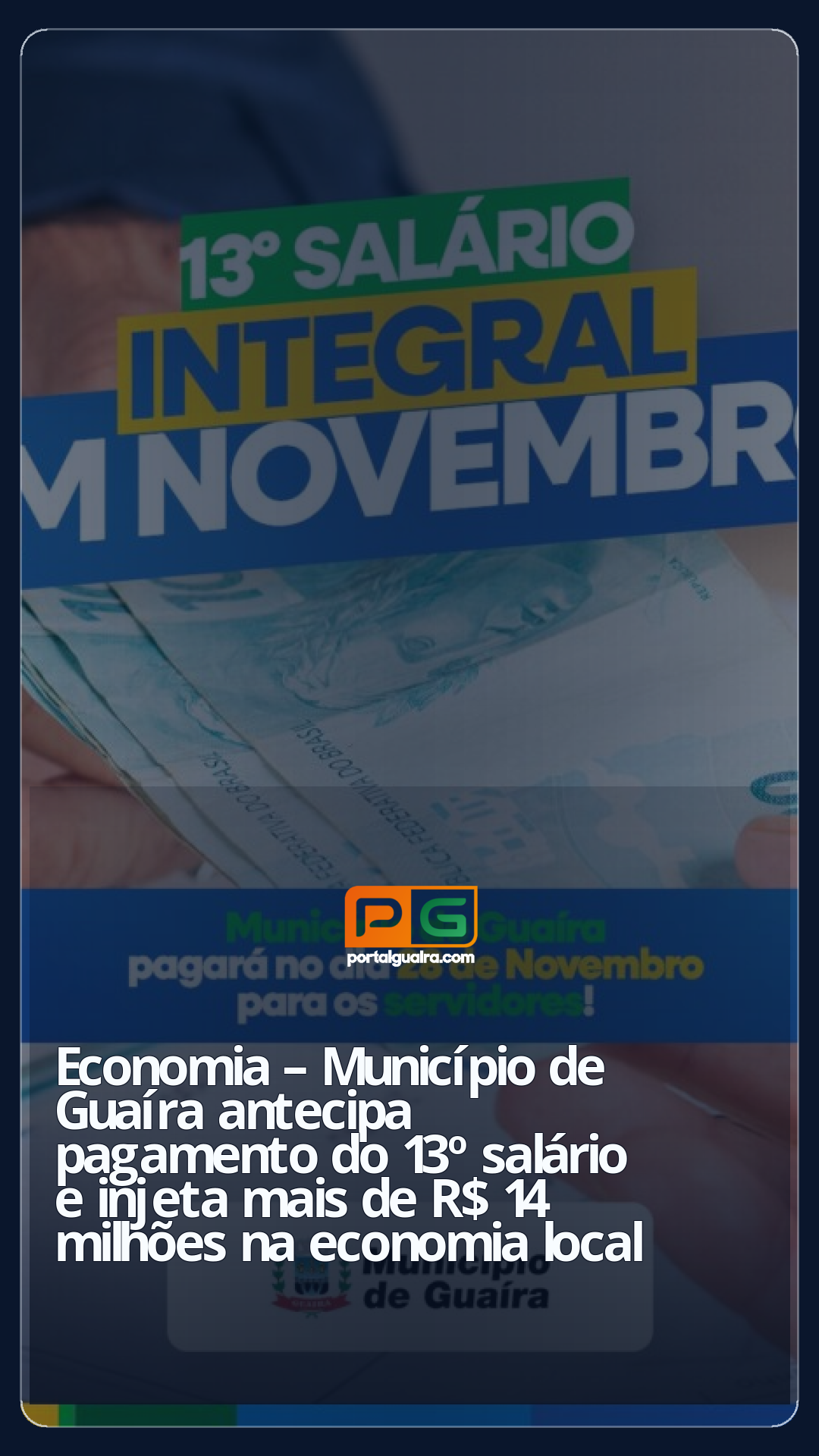 O Município de Guaíra confirma o pagamento integral do 13º salário e da folha referente ao mês de novembro aos mais de 1.300 servidores municipais nesta sexta-feira, 28 de novembro. A medida assegura o cumprimento rigoroso das obrigações com o funcionalismo e reforça o compromisso da gestão com a estabilidade financeira da administração pública.