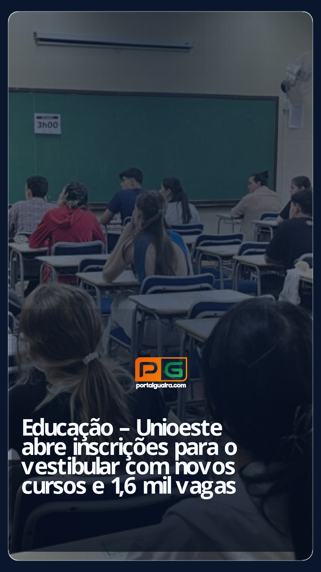 A Universidade Estadual do Oeste do Paraná (Unioeste) abriu na sexta-feira (5) as inscrições para o Vestibular 2026, trazendo novas opções de cursos: Psicologia, no campus de Foz do Iguaçu; Filosofia – bacharelado, nos turnos matutino e noturno, em Toledo; e Química Industrial – bacharelado, também em Toledo. As inscrições seguem até 10 de novembro. São 1,6 mil vagas em 67 cursos para o próximo ano.