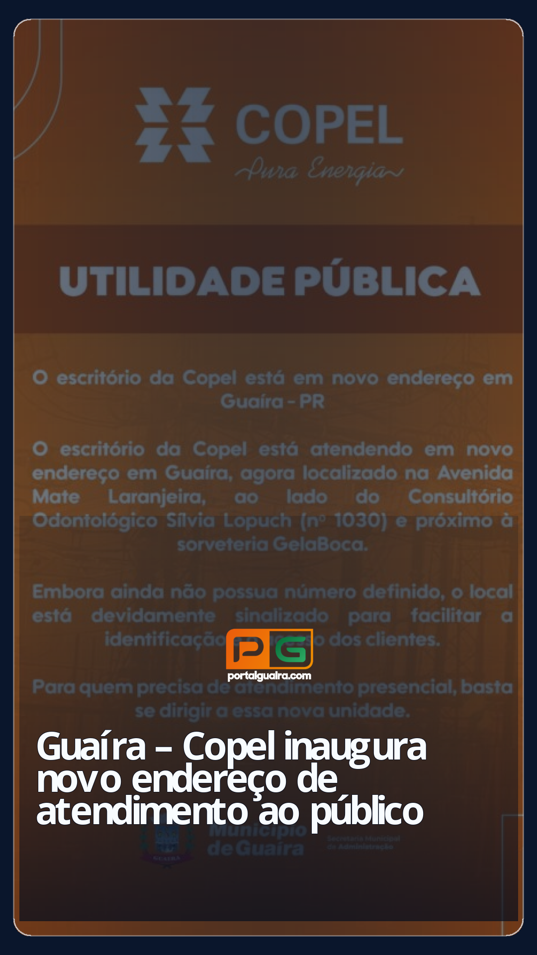 A Companhia Paranaense de Energia (Copel) está com novo endereço de atendimento presencial em Guaíra, no Oeste do Paraná. A partir desta semana, os moradores que precisarem de serviços presenciais devem se dirigir à nova unidade, localizada na Avenida Mate Laranjeira, ao lado do Consultório Odontológico Sílvia Lopuch (nº 1030) e nas proximidades da sorveteria GelaBoca.