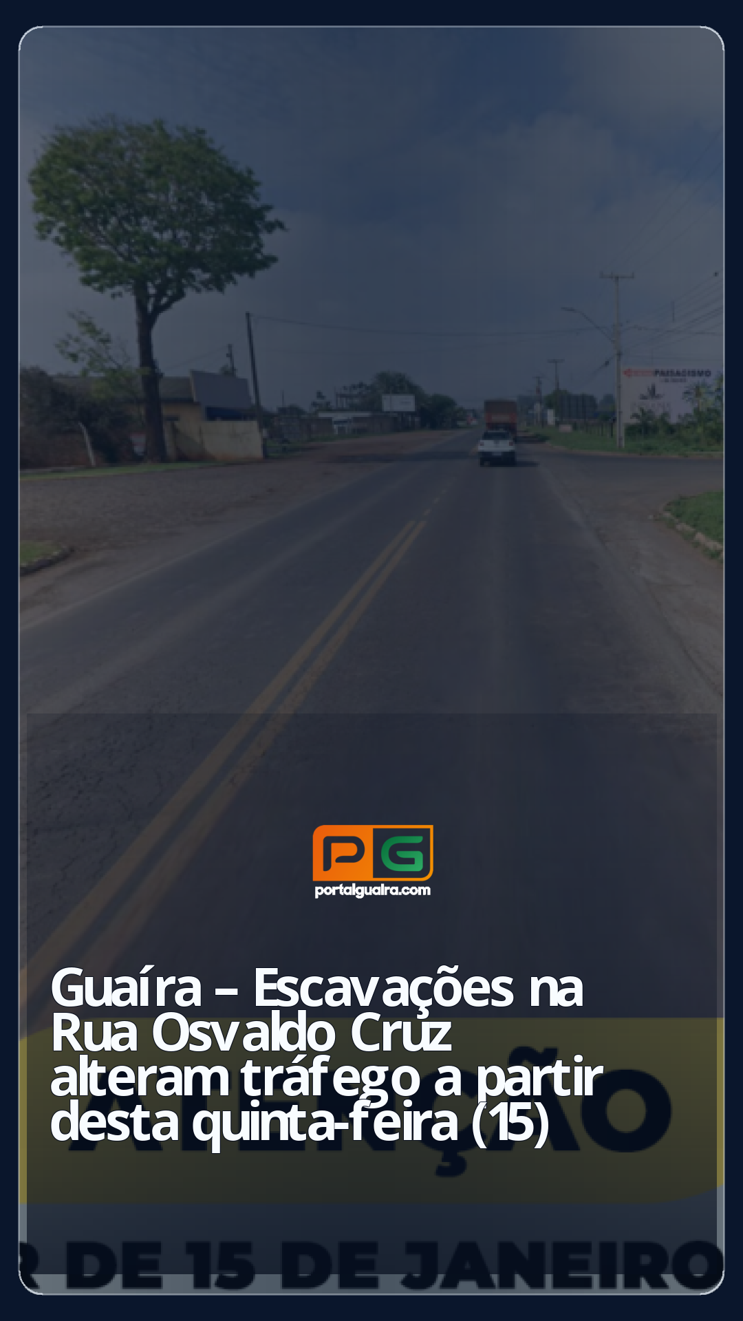 O Município de Guaíra informa que, desde às 7h desta quinta-feira (15), a Rua Osvaldo Cruz passa por alterações temporárias no tráfego em razão de escavações na pista.