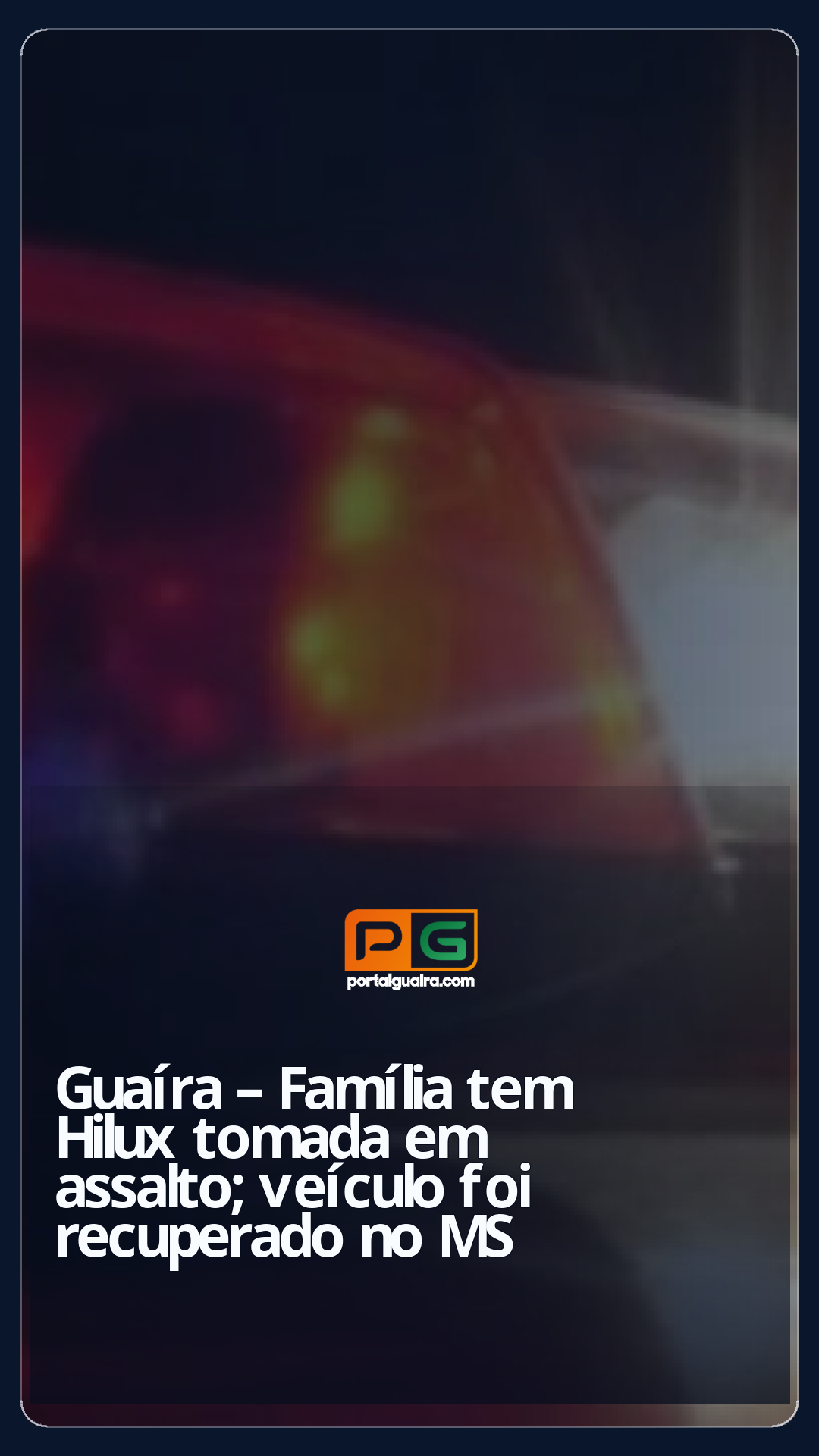 Na madrugada de ontem (26), por volta das 00h30, equipes da PM de Guaíra realizavam Patrulhamento Tático (PRTM) na área central da cidade quando avistaram um veículo Toyota/Hilux de cor preta, o qual transitava em alta velocidade, gerando suspeitas quanto à sua procedência. Diante disso, foi dado início a um acompanhamento tático pelas duas equipes, que seguiram o veículo, adentrando o estado do Mato Grosso do Sul e prosseguindo até as proximidades da divisa entre o Brasil e o Paraguai.