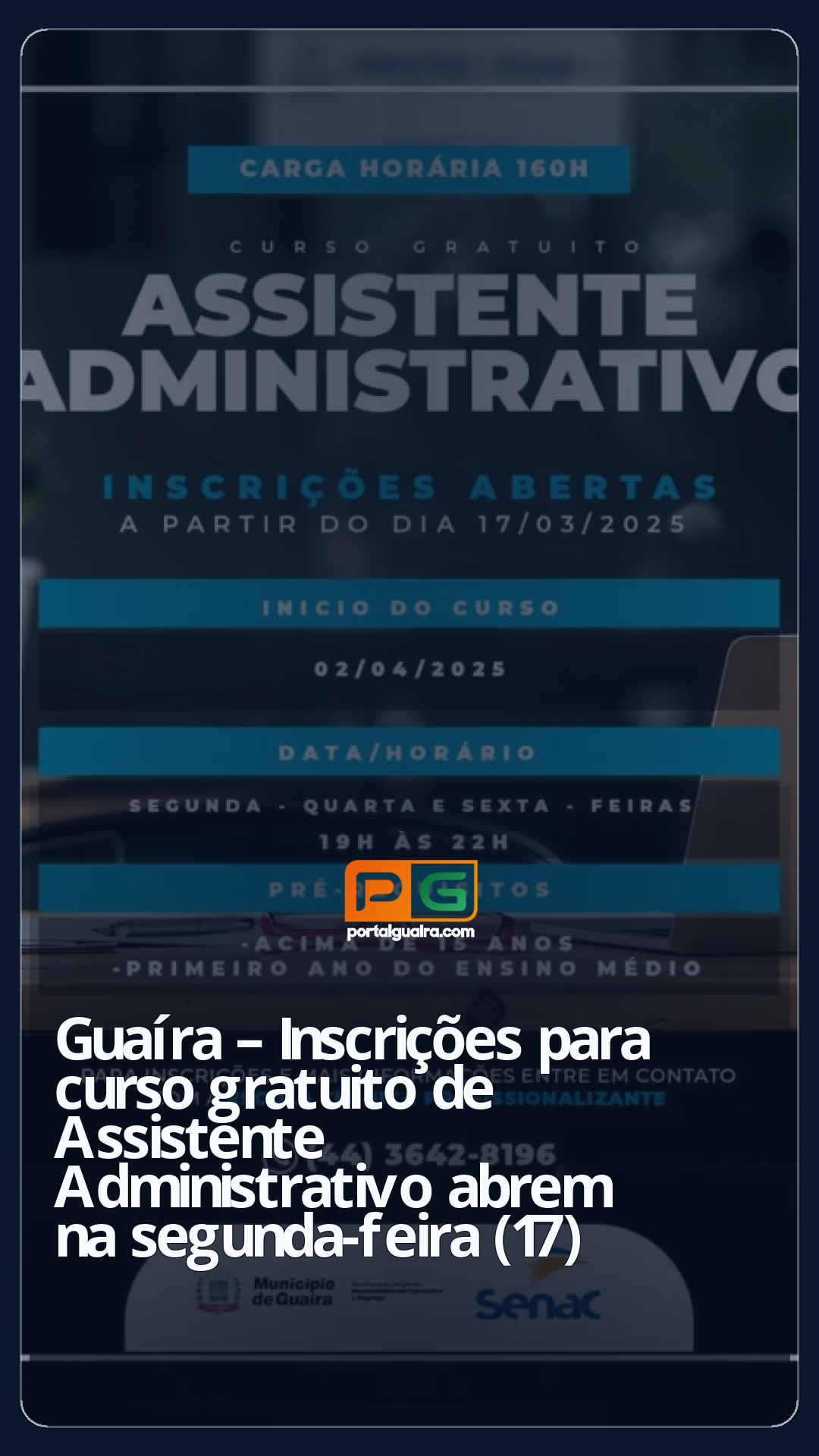 O Município de Guaíra, por meio da Secretaria Municipal de Desenvolvimento Econômico e Emprego (SEDE), informa que as inscrições para o curso gratuito de Assistente Administrativo, estão abertas.