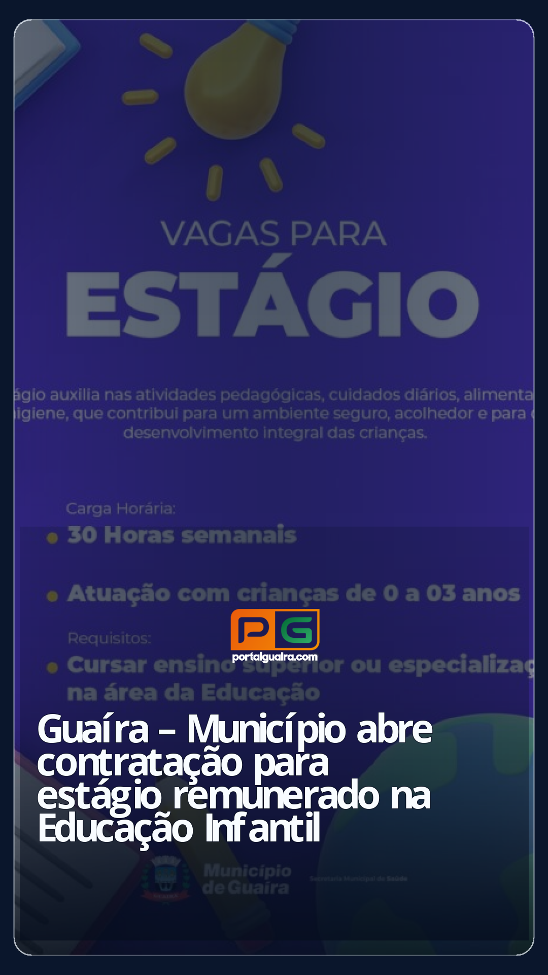 O Município de Guaíra, por intermédio da Secretaria Municipal de Educação, informa a abertura de contratação para estágio remunerado na Educação Infantil, com carga horária de 30 horas semanais. A atuação ocorre junto às crianças de 0 a 3 anos de idade.