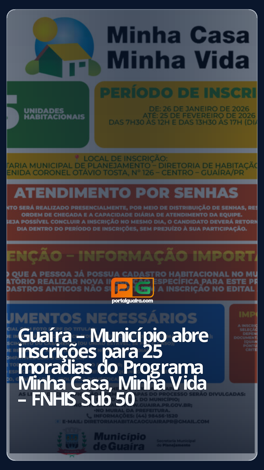 O Município de Guaíra, por meio da Secretaria Municipal de Planejamento e da Diretoria de Habitação, publicou o Edital nº 001/2026, que regulamenta o processo de seleção de famílias para 25 unidades habitacionais do Programa Minha Casa, Minha Vida – Faixa 1, na modalidade FNHIS Sub 50.