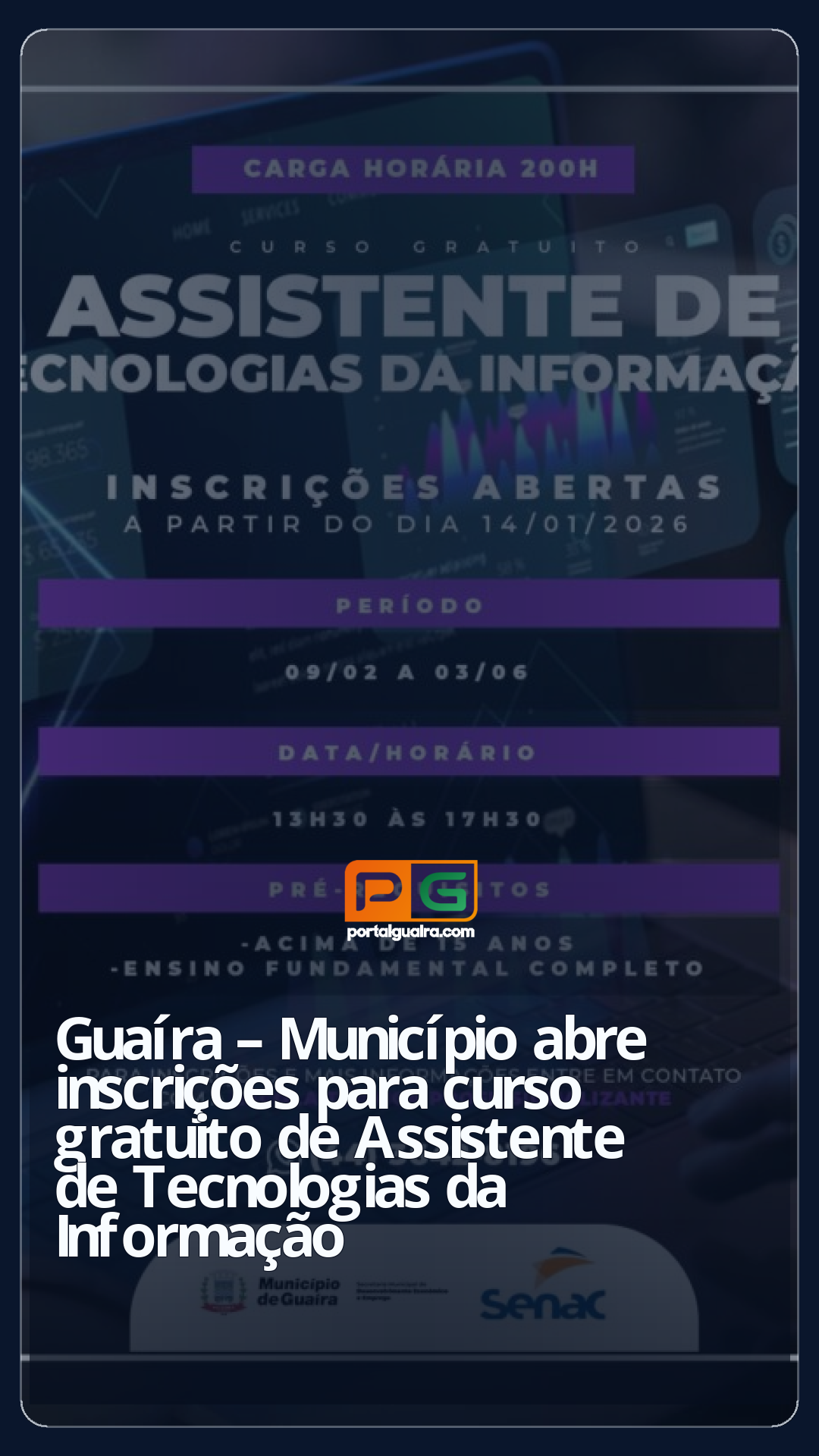 O Município de Guaíra divulga a abertura de inscrições para o curso gratuito Assistente de Tecnologias da Informação, ofertado pelo Senac, por meio da Escola Técnica Profissionalizante. A formação integra as ações de qualificação profissional e amplia as oportunidades de inserção no mercado de trabalho.