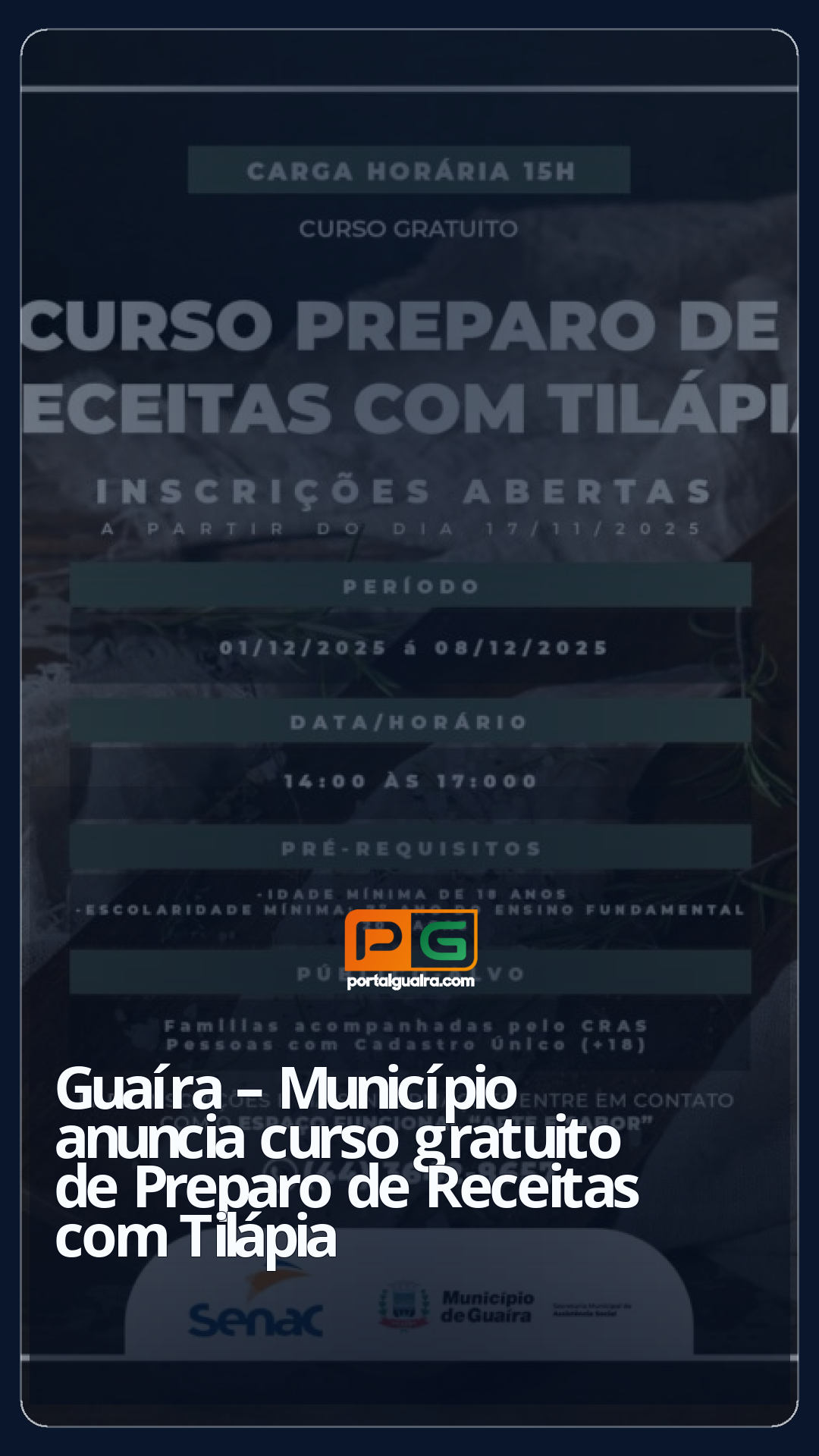 O Município de Guaíra, por meio da Secretaria Municipal de Assistência Social (SEMAS), anuncia a abertura das inscrições para o curso “Preparo de Receitas com Tilápia”, realizado em parceria com o Centro de Referência de Assistência Social (CRAS) e o Serviço Nacional de Aprendizagem Comercial (SENAC).