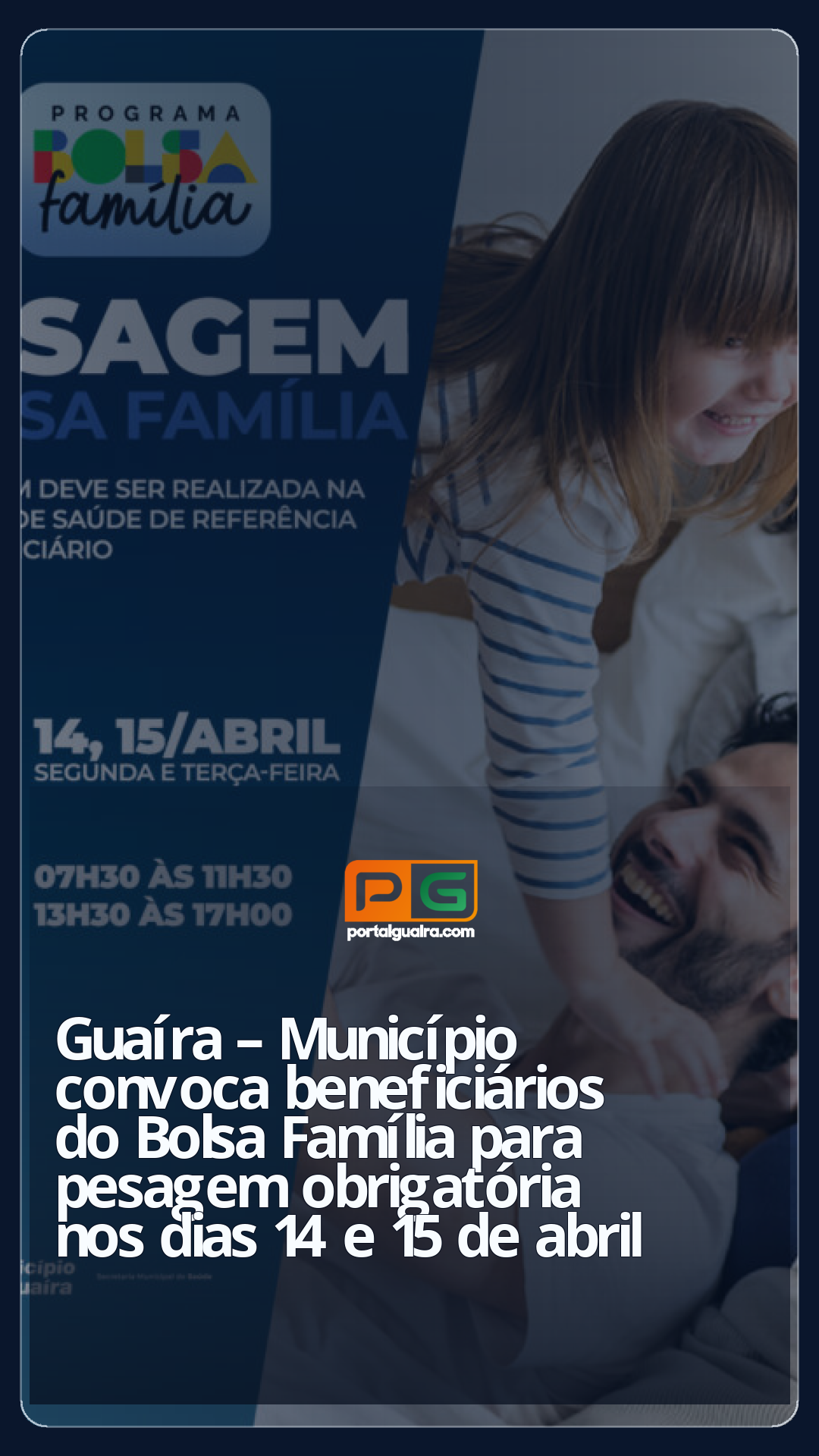 O Município de Guaíra por meio da Secretaria de Saúde, convida toda a população beneficiária do Programa Bolsa Família a participar das ações de saúde previstas para o mês de abril. A pasta informa que, nesta segunda e terça-feira, dias 14 e 15, será realizada a pesagem obrigatória, um dos requisitos fundamentais para a continuidade do recebimento do benefício.