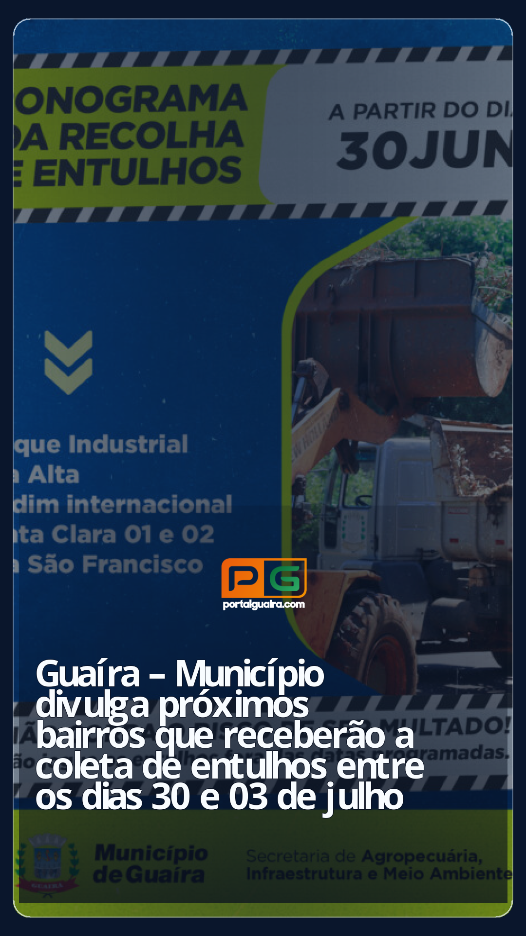 Em relação ao processo contínuo do cronograma do rodízio de limpeza urbana, o Município de Guaíra, por meio da Diretoria de Limpeza Pública da SEMAIM – Secretaria Municipal de Agropecuária, Infraestrutura e Meio Ambiente, informa os bairros que receberão os serviços de recolhimento de entulhos na próxima semana. Entre os dias 30 e 03 de julho, as equipes estarão nos seguintes locais: