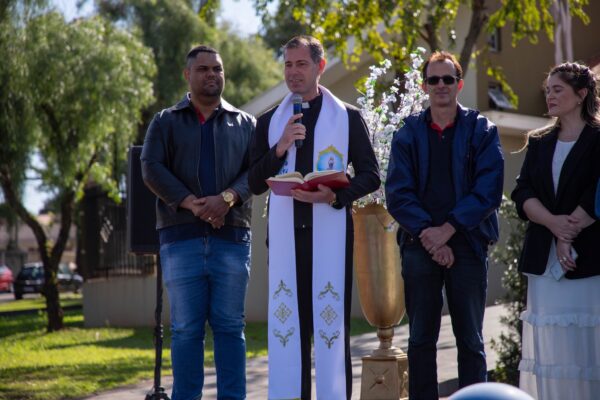 O momento solene ainda contou com a benção e saudação do padre Jauri, da Paróquia Nossa Senhora dos Navegantes, e com o descerramento da placa inaugural e o desenlace da fita, seguidos da tradicional foto oficial com os representantes da frente de honra.