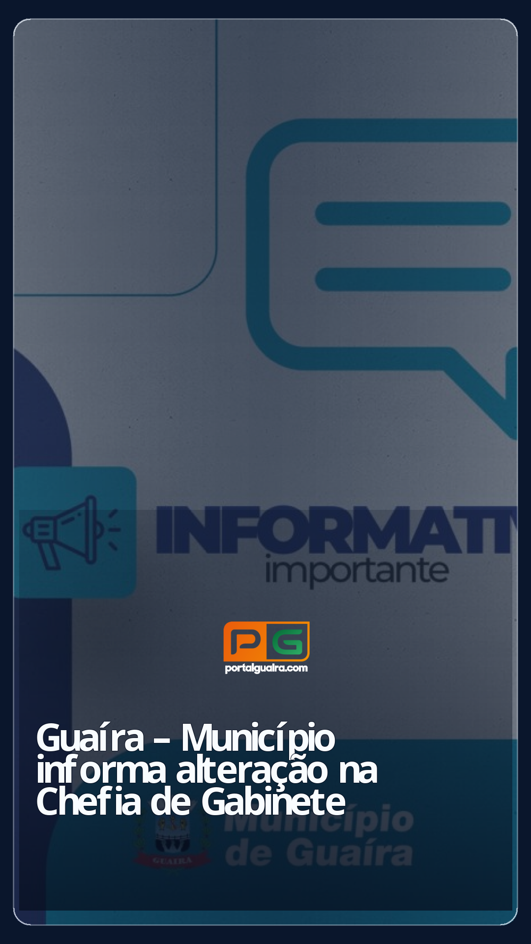 O Município de Guaíra informa à população a alteração na Chefia de Gabinete do Poder Executivo Municipal, formalizada por meio dos Decretos nº 018/2026 e nº 019/2026, publicados em 13 de janeiro de 2026.
