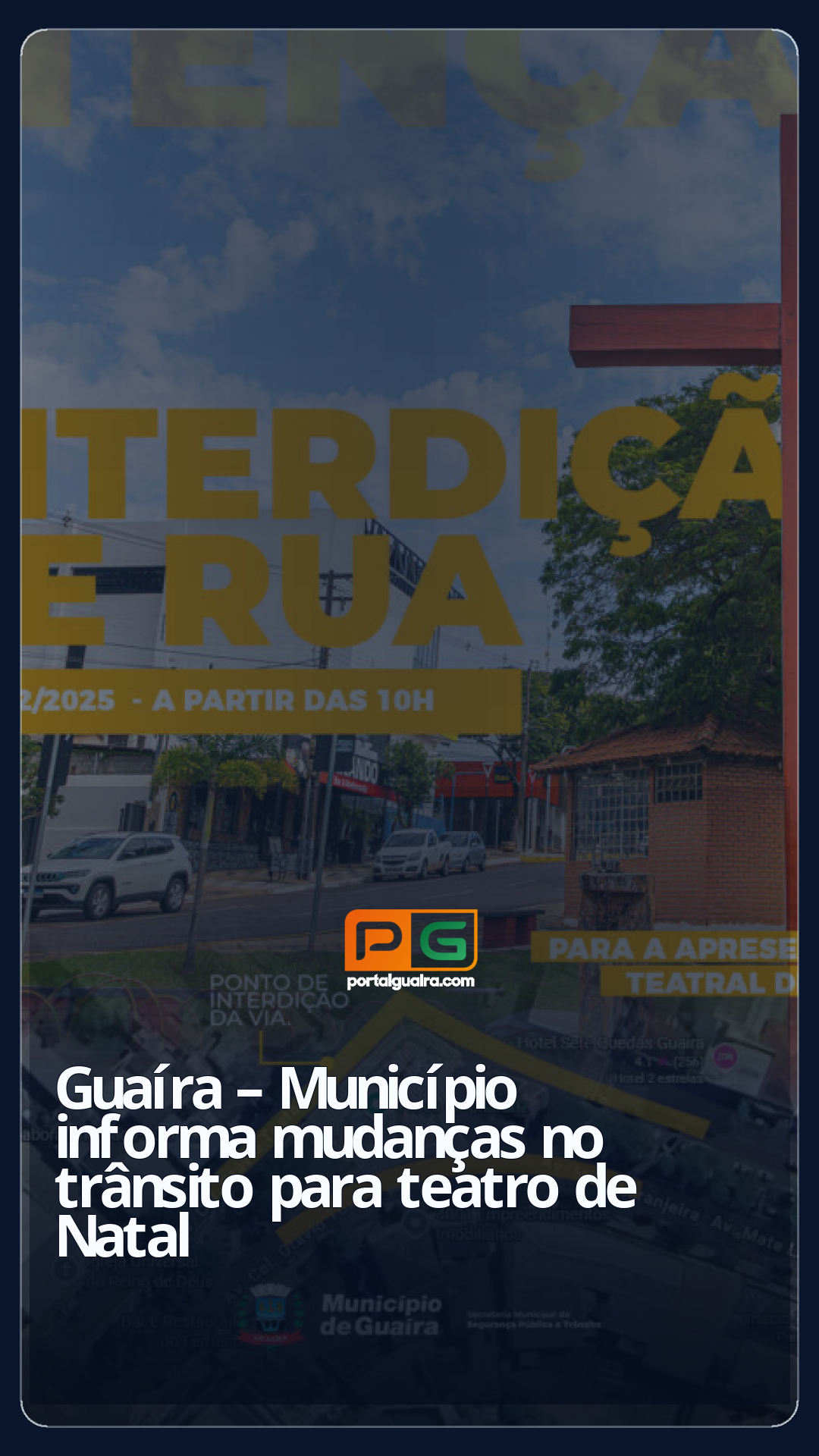 O Município de Guaíra, por intermédio da Secretaria de Segurança Pública e Trânsito – SEMST, informa que no dia 1º de dezembro, a partir das 10h, haverá interdições temporárias para a realização de uma apresentação teatral de Natal. Será interditado apenas uma faixa de cada sentido da via.