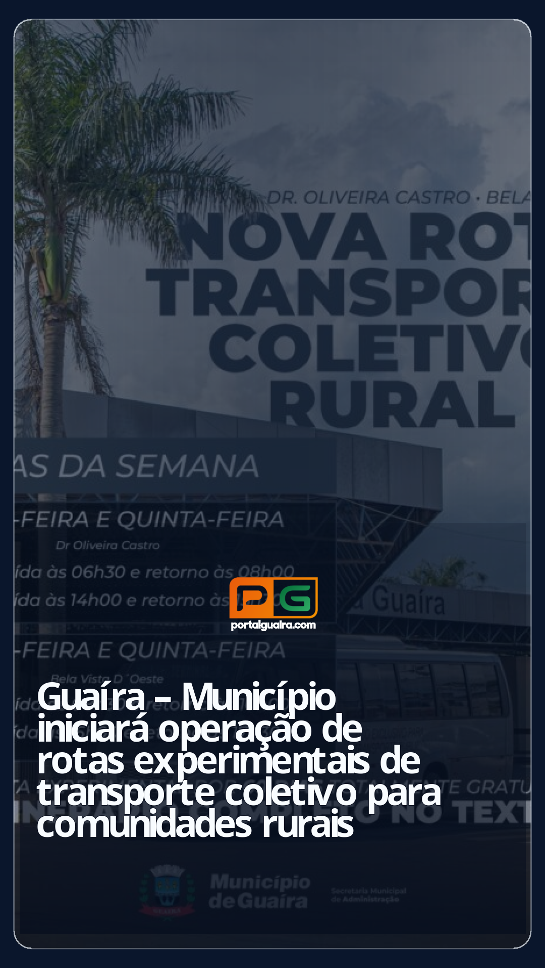 O Município de Guaíra, por intermédio da Secretaria Municipal de Administração (SEADM), informa à população que, a partir do dia 12 de agosto, serão iniciadas duas rotas experimentais de transporte coletivo voltadas às comunidades rurais. As linhas funcionarão às terças e quintas-feiras, com saídas às 06h30 e 08h30, e retornos às 08h00 e 10h00, com partida do Terminal Rodoviário de Guaíra com destino a Dr. Oliveira Castro e Bela Vista D’Oeste, respectivamente.