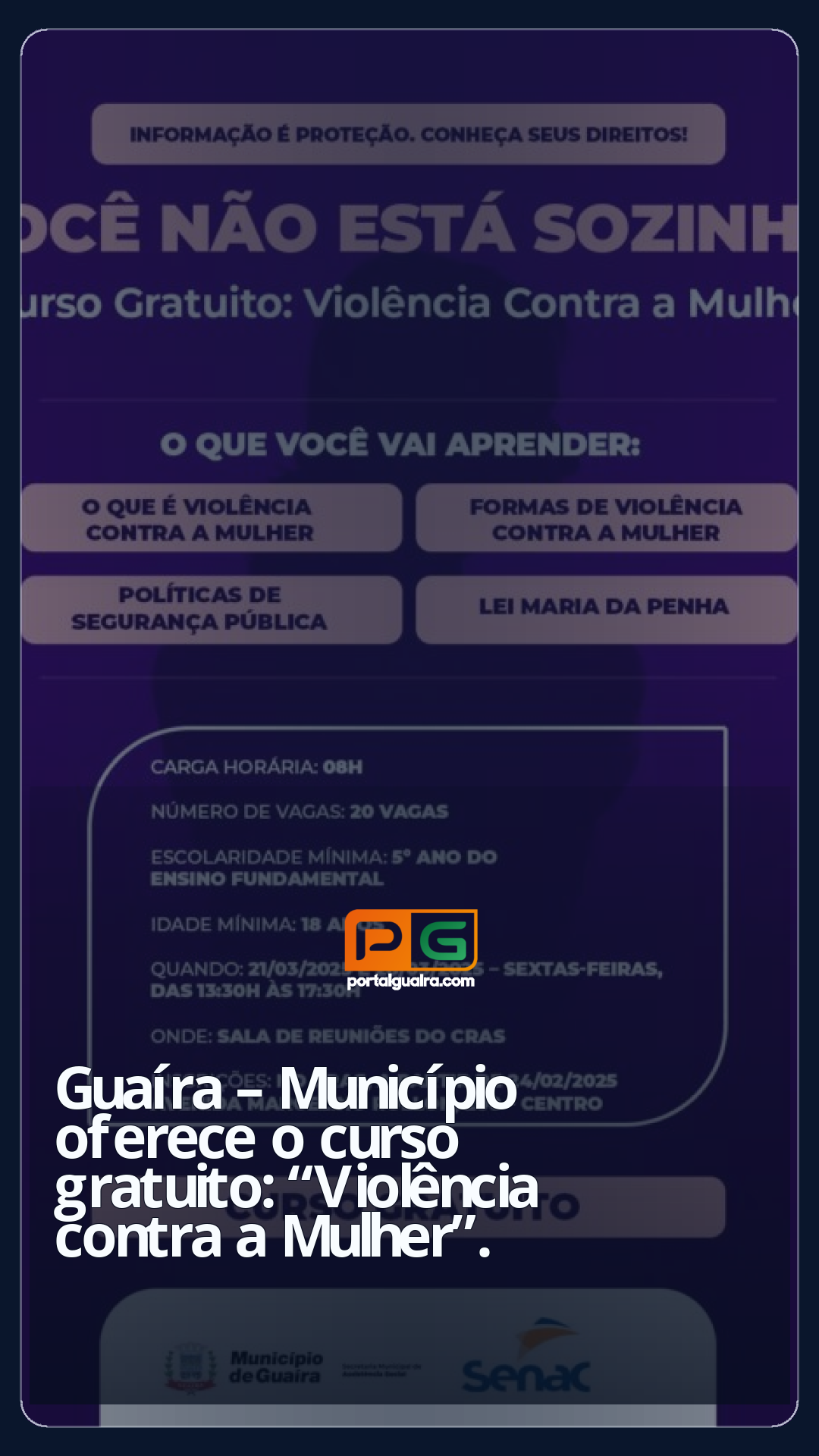 O Município de Guaíra, por meio da Secretaria Municipal de Assistência Social (SEMAS), anuncia a realização do curso: VOCÊ NÃO ESTÁ SOZINHA – “Violência contra a Mulher”, uma oportunidade de aprendizado essencial sobre o tema.