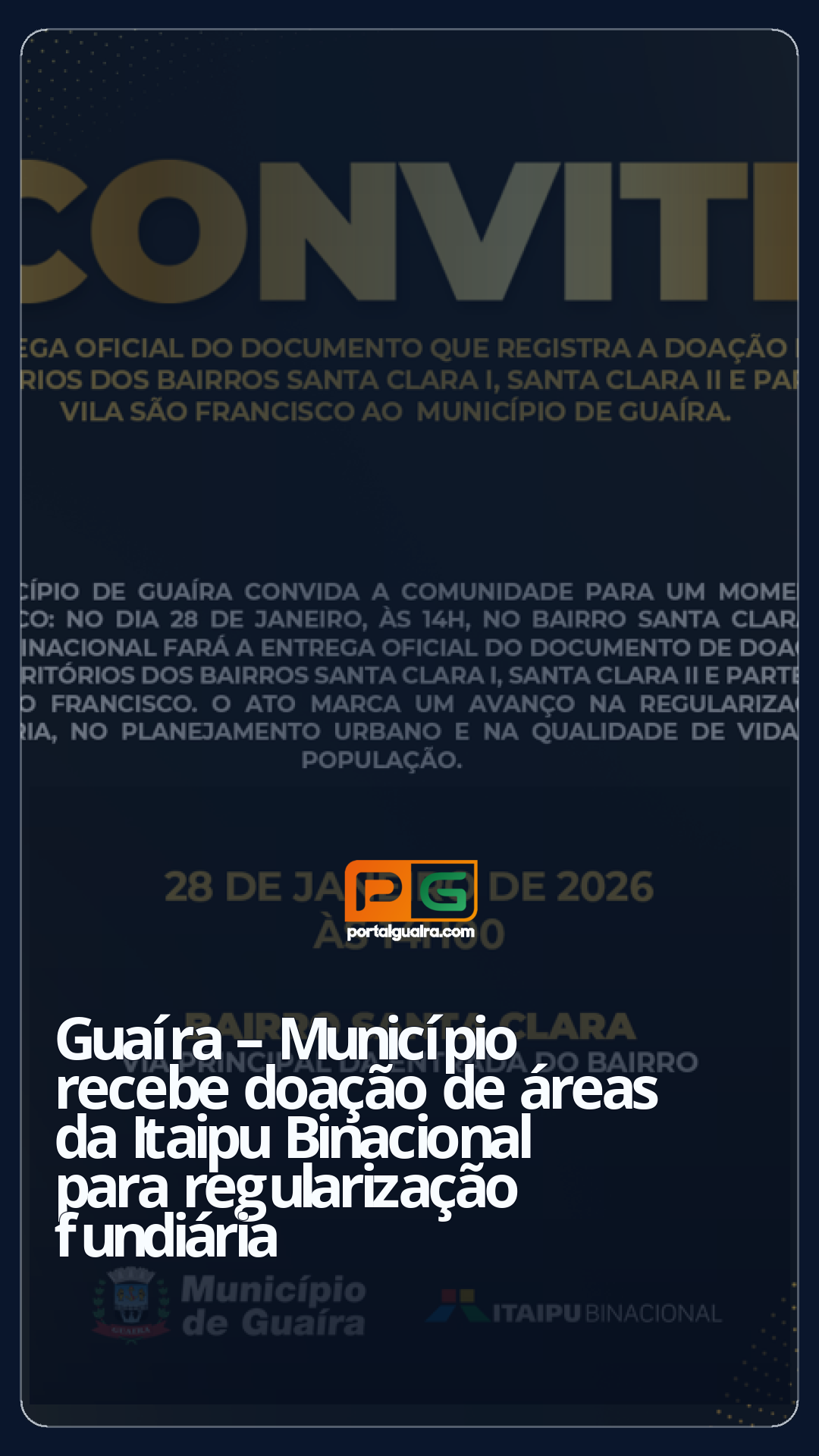 O Município de Guaíra alcança um marco histórico na gestão de seu território e no compromisso com o bem-estar social. Por meio da Lei Complementar nº 003/2025, o Poder Executivo Municipal obteve a autorização necessária para receber, via doação da Itaipu Binacional, diversas áreas urbanas localizadas nas Vilas Santa Clara I e II, e também na Vila São Francisco.