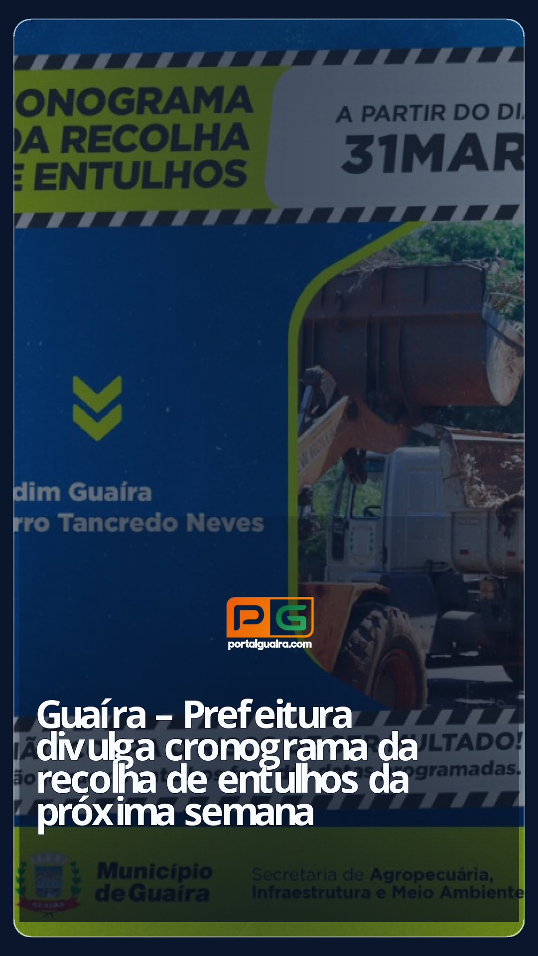 O Município de Guaíra por intermédio da Diretoria de Limpeza Pública da Secretaria de Agropecuária, Infraestrutura e Meio Ambiente, informa os bairros que receberão a equipe da limpeza de entulho na próxima semana de 31/03 a segunda-feira dia 31 de março 04 de abril.