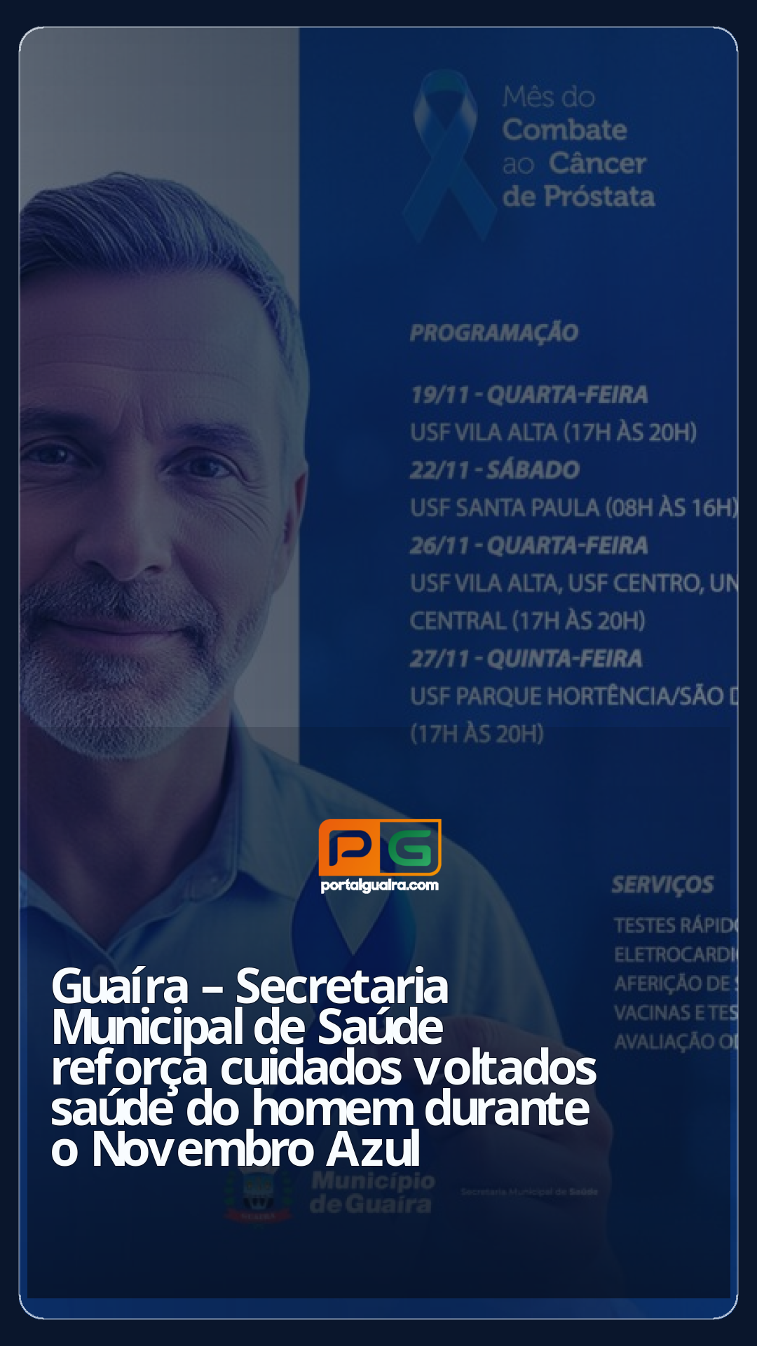 O Município de Guaíra, por meio da Secretaria Municipal de Saúde, anuncia a programação especial de atendimentos dedicada à saúde do homem durante o mês de novembro, em alusão à Campanha Novembro Azul. As ações têm como objetivo reforçar a importância da prevenção, do diagnóstico precoce e do cuidado contínuo com a saúde masculina.