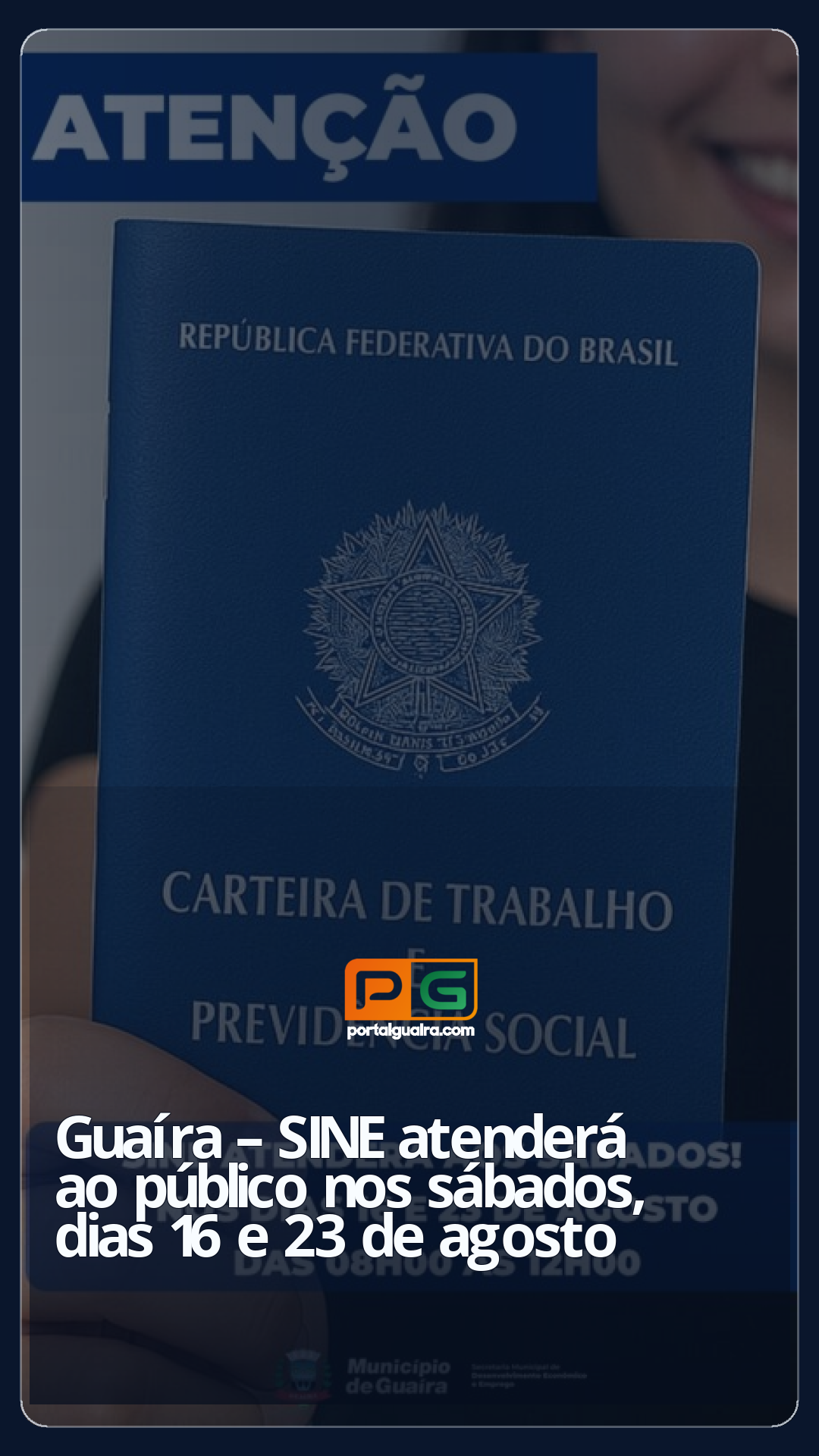 O Município de Guaíra, por meio da Diretoria Especial do Trabalho – SINE, vinculada à Secretaria Municipal de Desenvolvimento Econômico e Emprego – SEDE, informa que haverá atendimento ao público nos sábados, dias 16 e 23 de agosto, das 08h às 12h.