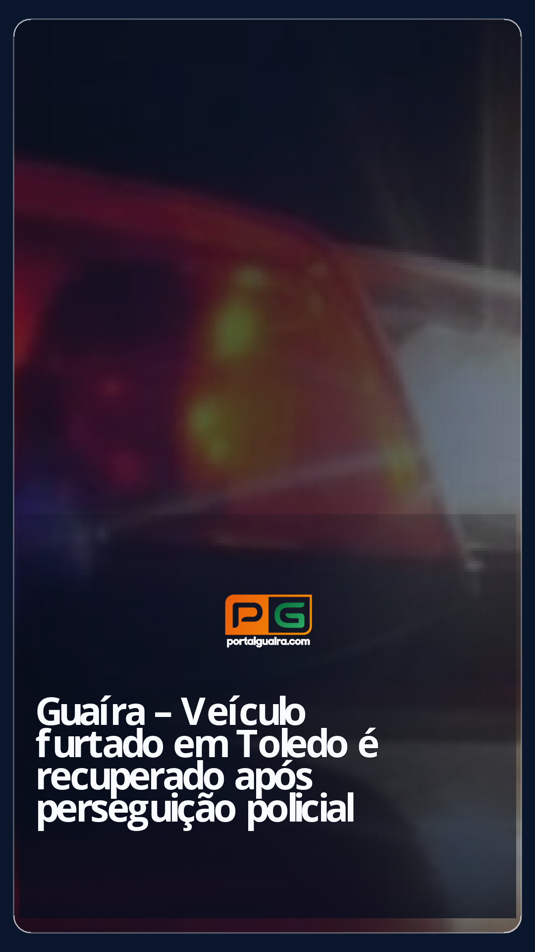 Por volta da 1h20 da madrugada, uma equipe da RPA recuperou um veículo furtado após uma perseguição policial pelas rodovias da região Oeste do Paraná. A ação teve início após a corporação receber informações sobre o furto de uma Toyota/Hilux SW4 ocorrido na cidade de Toledo.