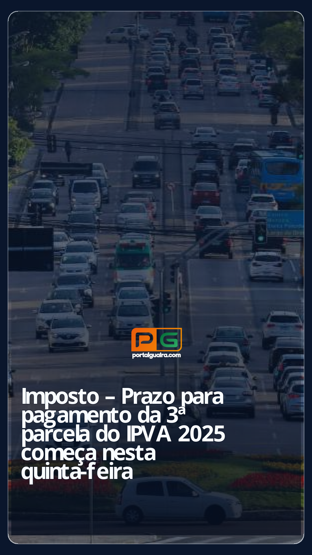 O prazo para pagamento da terceira parcela do Imposto sobre a Propriedade de Veículos Automotores (IPVA) 2025 inicia nesta quinta-feira (20) para proprietários de veículos com placas de final 1 e 2. A data marca o reinício do calendário de pagamentos, que seguirá até a próxima semana para os demais motoristas.