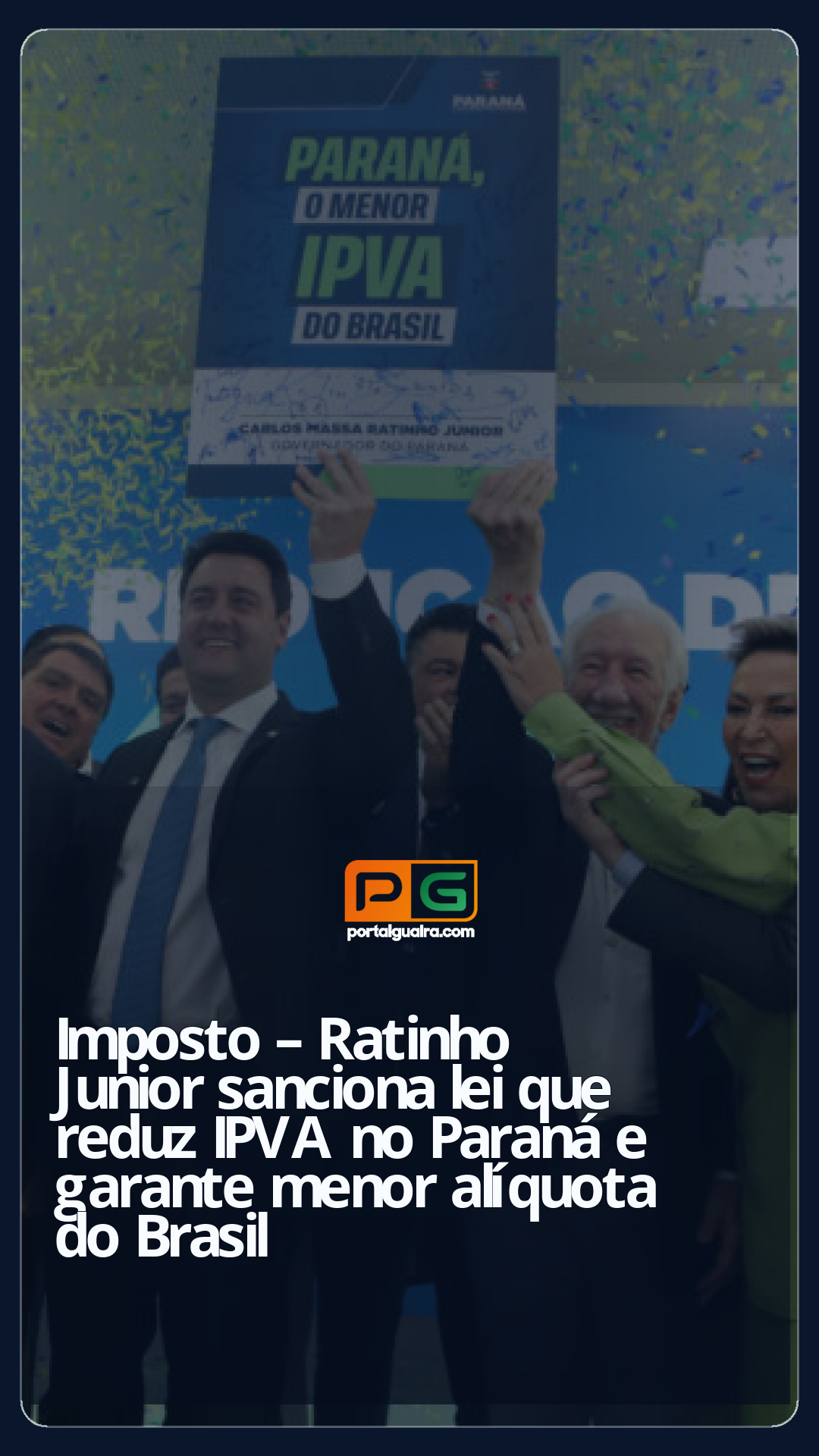 Agora é lei: o Paraná tem o menor IPVA do Brasil. A nova alíquota do Imposto sobre a Propriedade de Veículos Automotores foi reduzida de 3,5% para 1,9% do valor venal de automóveis, motocicletas e caminhonetes na terça-feira (23) após a sanção pelo governador Carlos Massa Ratinho Junior, em Curitiba. A medida beneficia cerca de 3,4 milhões de proprietários de veículos em todo o Estado, que pagarão 45% a menos de imposto anualmente.