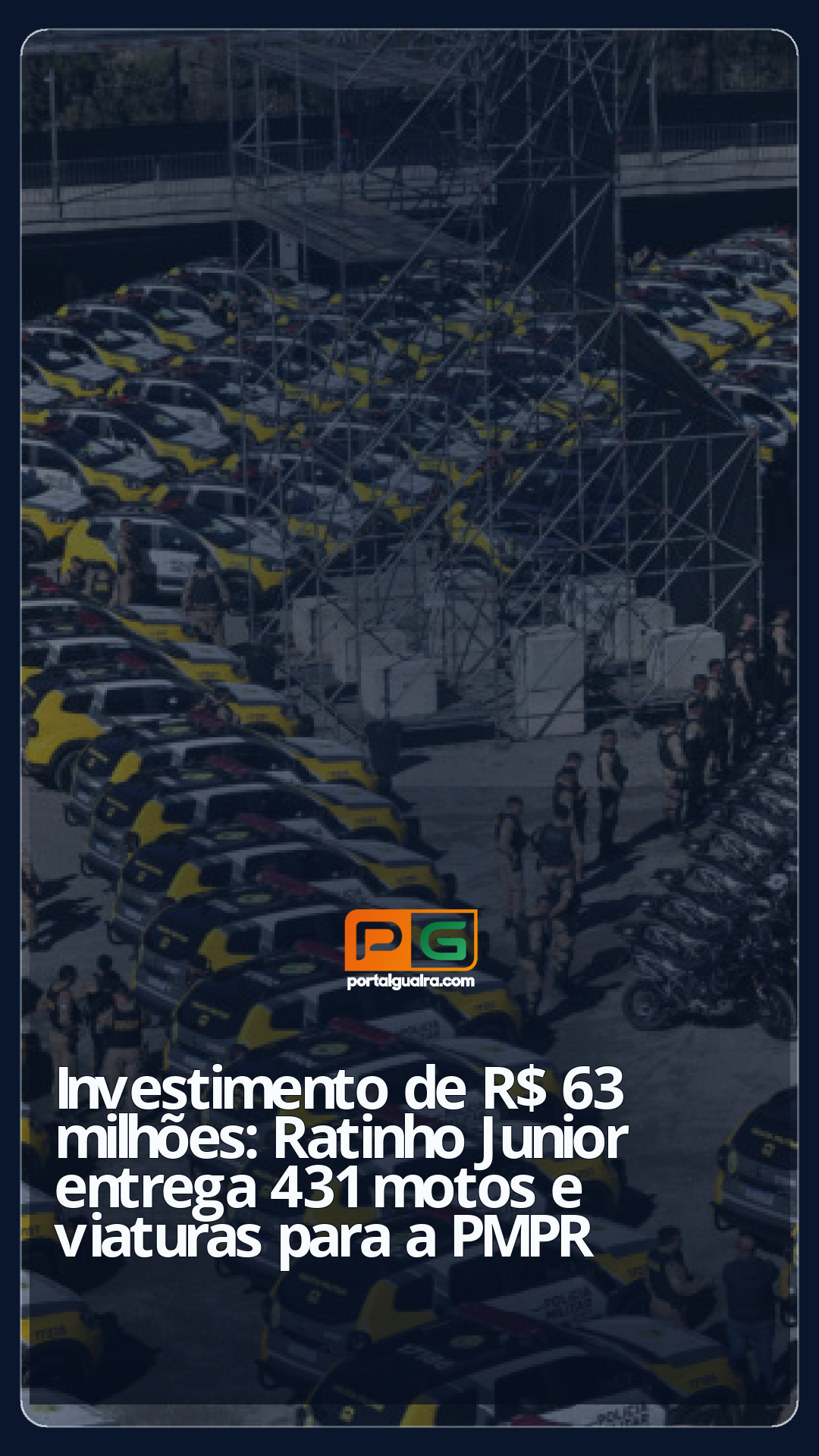 O governador Carlos Massa Ratinho Junior entregou na terça-feira (17) 209 motocicletas e 222 automóveis novos para as forças tática e operacional da Polícia Militar do Paraná (PMPR). Foram investidos R$ 63,2 milhões para a renovação da frota de viaturas, que serão distribuídos para diversas unidades da PMPR, incluindo o Batalhão de Operações Especiais (BOPE) e a Patrulha Maria da Penha.