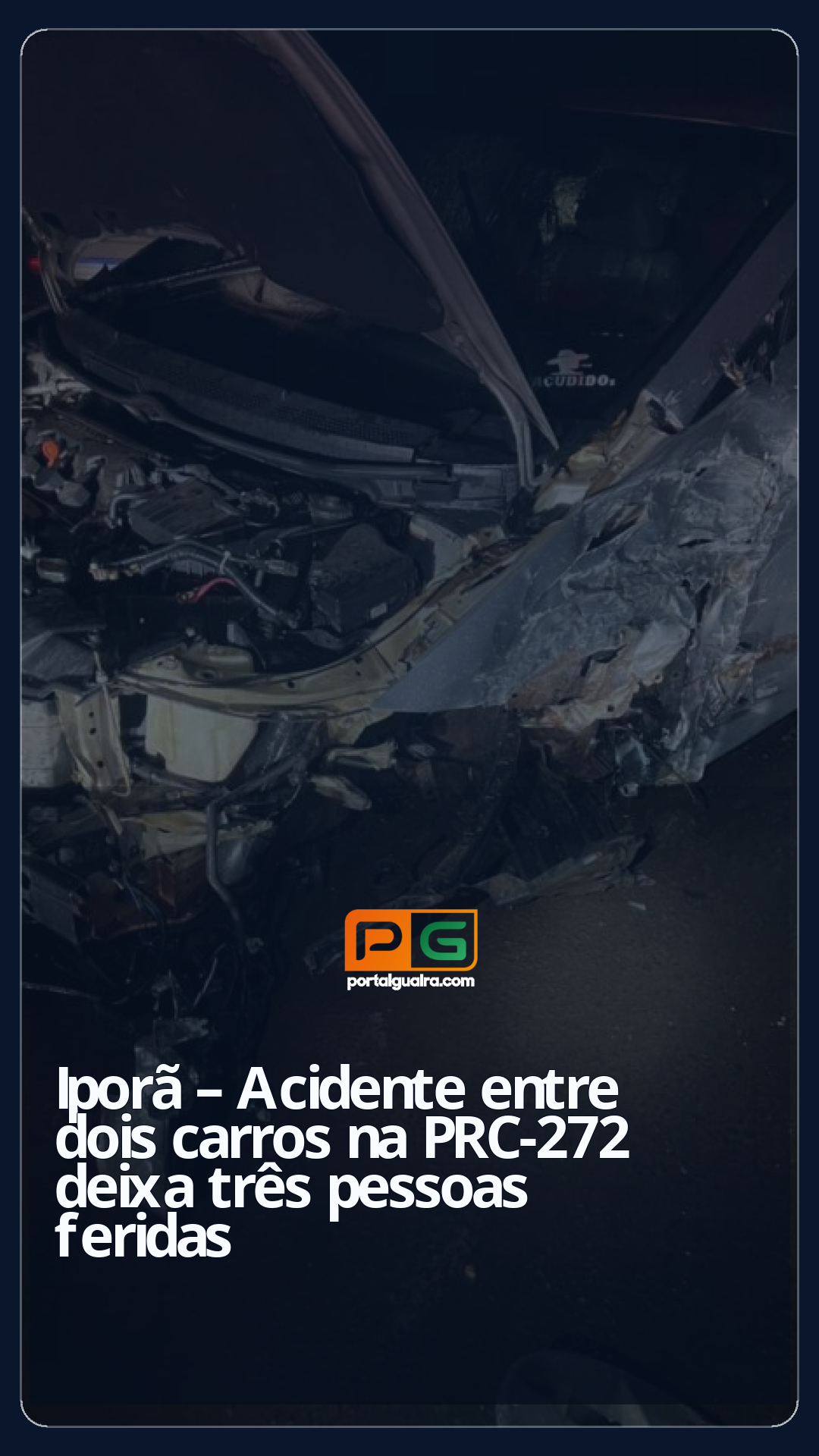 Um acidente entre dois carros deixou três pessoas feridas no início da noite de sábado (7), na PRC-272, km 512,8, entre os municípios de Iporã e Francisco Alves. A colisão ocorreu por volta das 18h20, em trecho molhado pela chuva, o que pode ter contribuído para o desfecho.