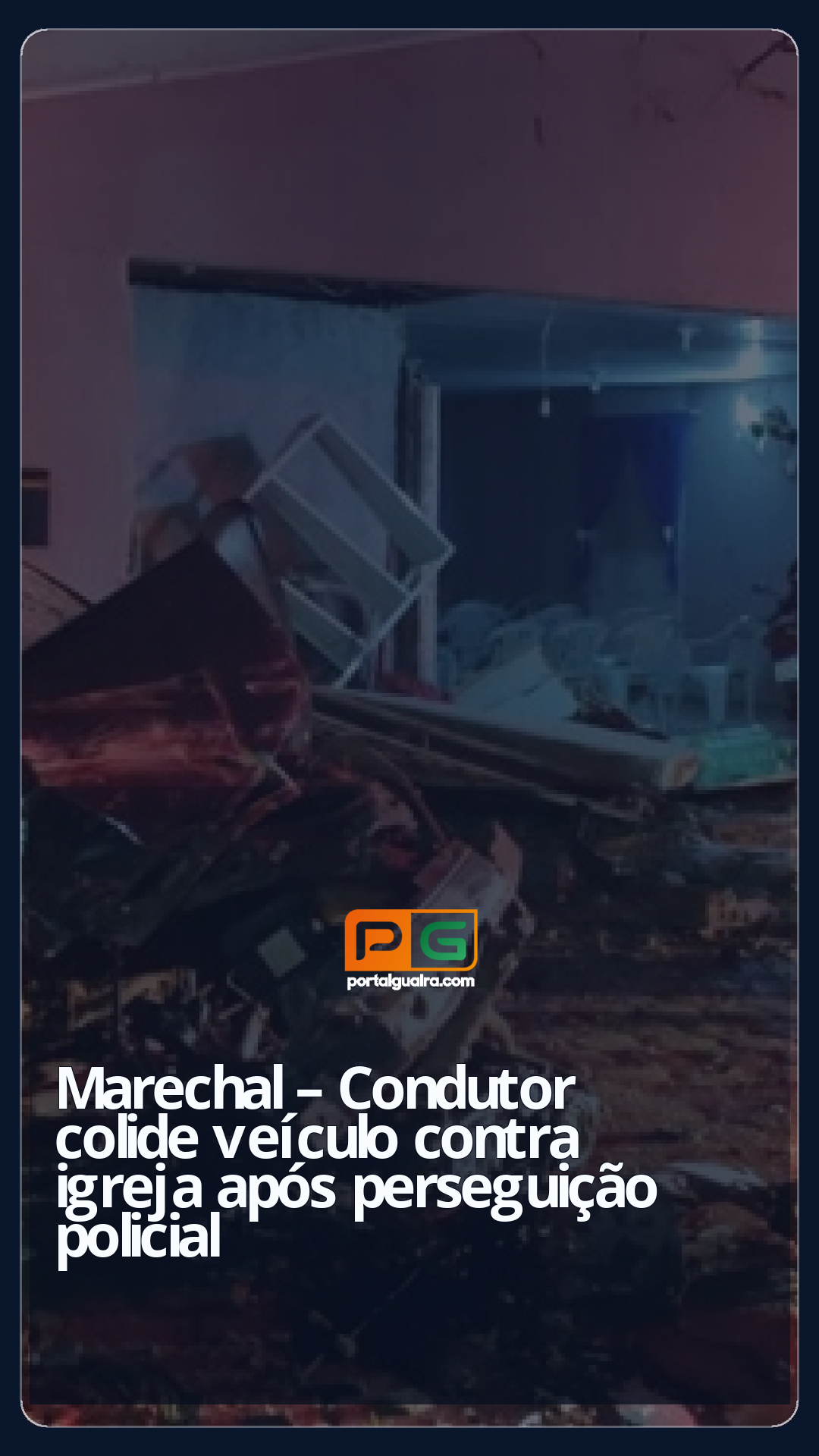 Durante a fuga, ao transitar por uma lombada elevada, o condutor perdeu o controle do Fiat Palio, que colidiu violentamente contra a fachada de uma igreja localizada no Bairro Botafogo. O impacto destruiu grande parte da estrutura frontal do templo religioso e deixou o veículo completamente danificado.
