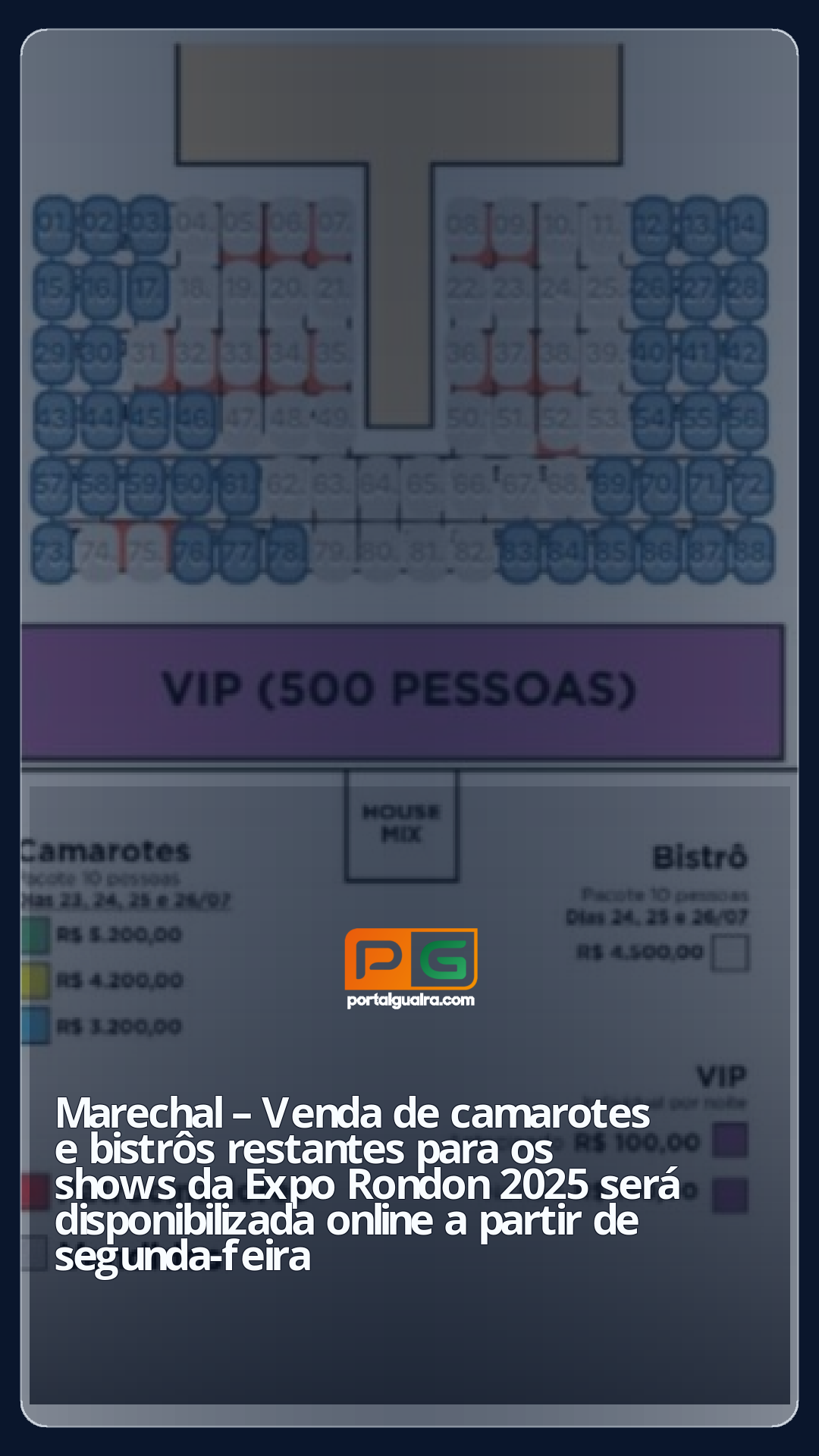 Até este sábado, dia 14, a venda de camarotes e bistrôs restantes para os shows da Expo Rondon 2025 é feita exclusivamente na Central de Venda de Ingressos, no parque de exposições, pela Assemar (Associação dos Servidores Públicos Municipais de Marechal Cândido Rondon).