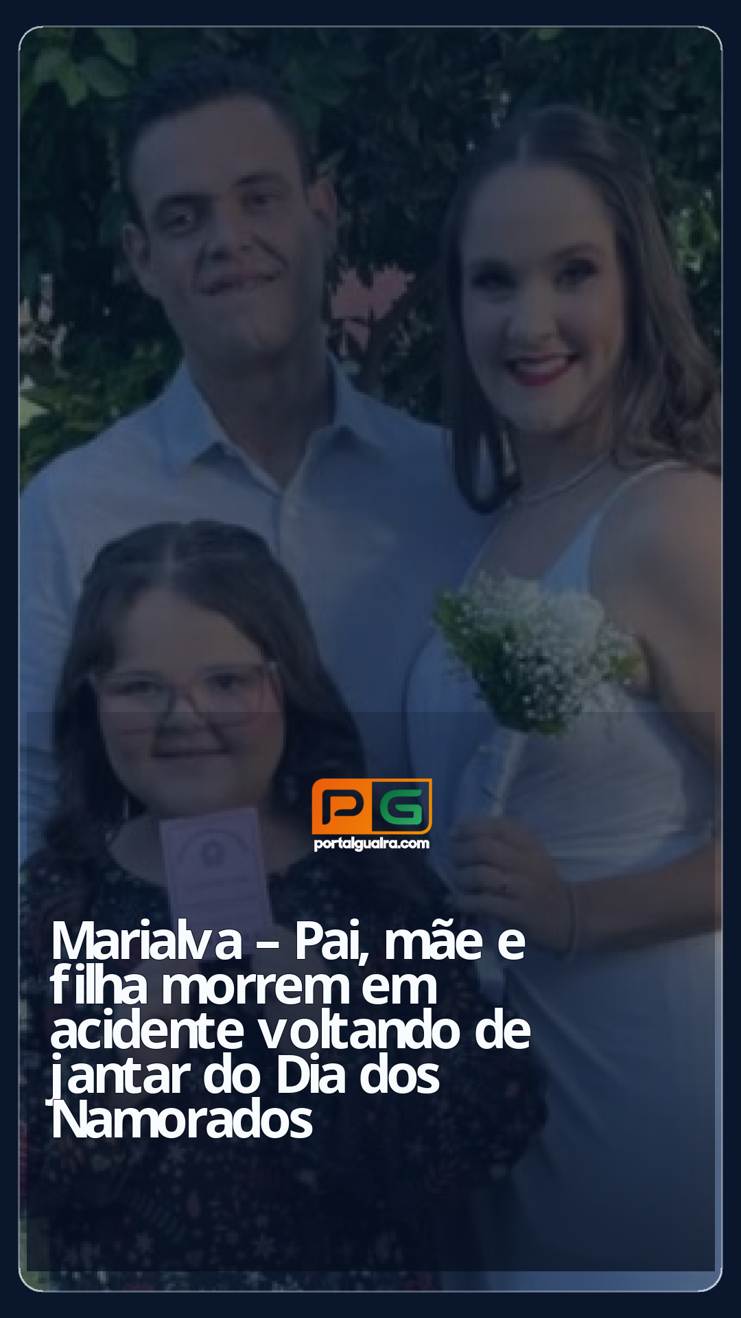 Pai, mãe e filha morreram em um acidente na PR-897, em Marialva, no norte do Paraná. Eles foram identificados como Andressa Feliciano, de 27 anos, Maycon Lennon, de 34, e Eloísa Feliciano Gimenes, de 8. Segundo a família, os três estavam voltando de um jantar de Dia dos Namorados.
