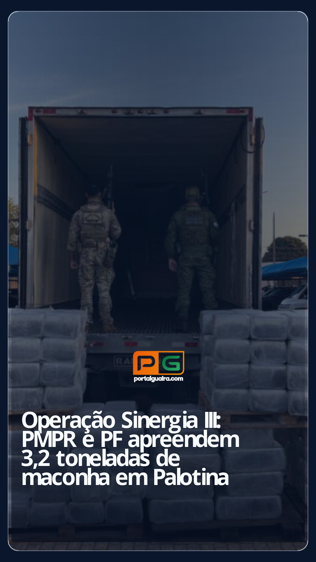 A Polícia Militar do Paraná, por meio do Batalhão de Polícia de Fronteira (BPFron), e a Polícia Federal, com o apoio do Núcleo Especial de Polícia Marítima (NEPOM), apreenderam cerca de 3,2 toneladas de maconha na manhã de quinta-feira (18), em Palotina, no Oeste. A ação ocorreu no âmbito da Operação Sinergia III.