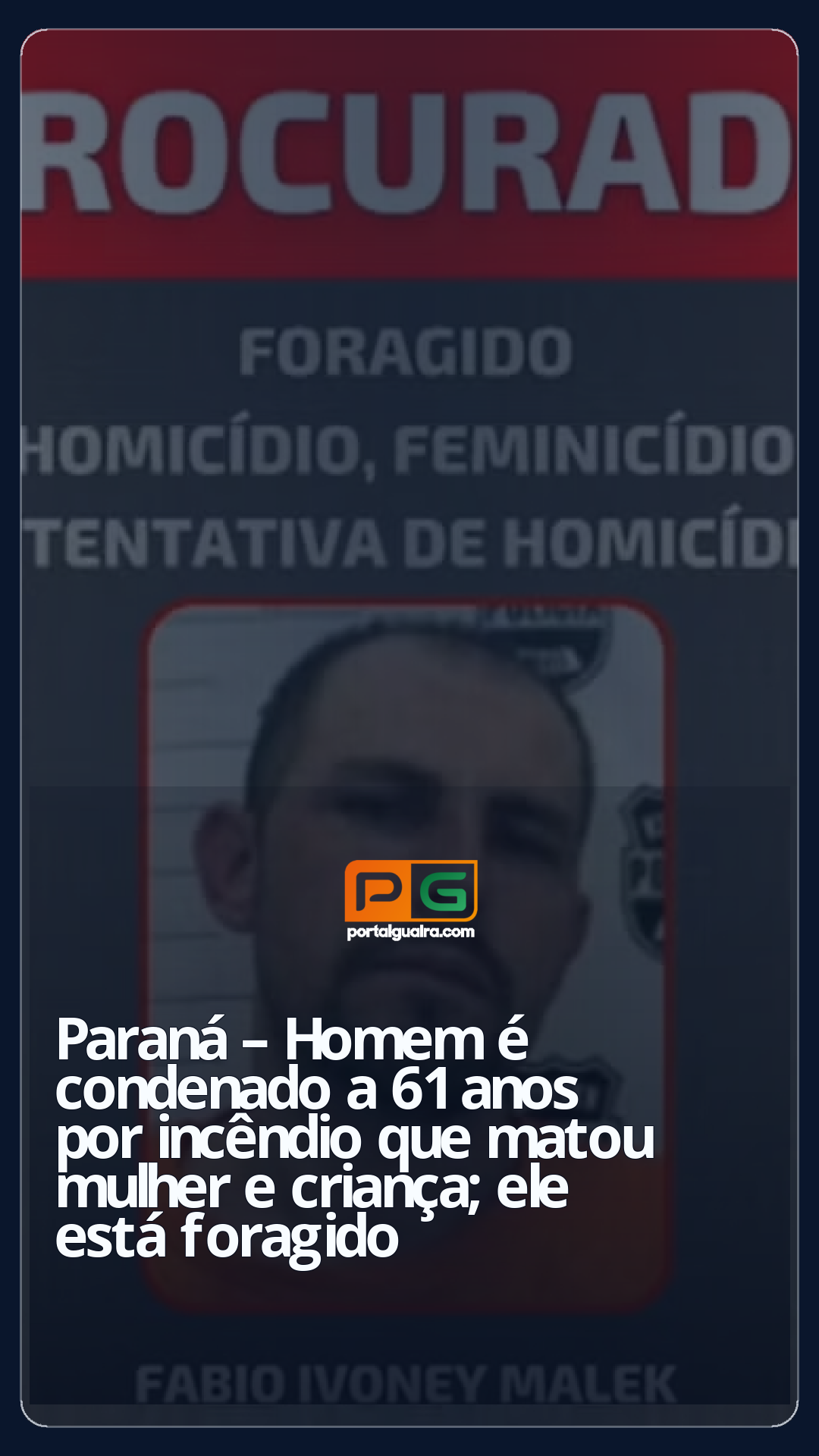 Um homem foi condenado pelo Tribunal do Júri a 61 anos de prisão por matar uma mulher e uma criança de três anos após atear fogo na casa delas em Laranjeiras do Sul, na região Central do Paraná. Fábio Ivoney Malek, de 42 anos, é considerado foragido, segundo a Polícia Civil (PC-PR).