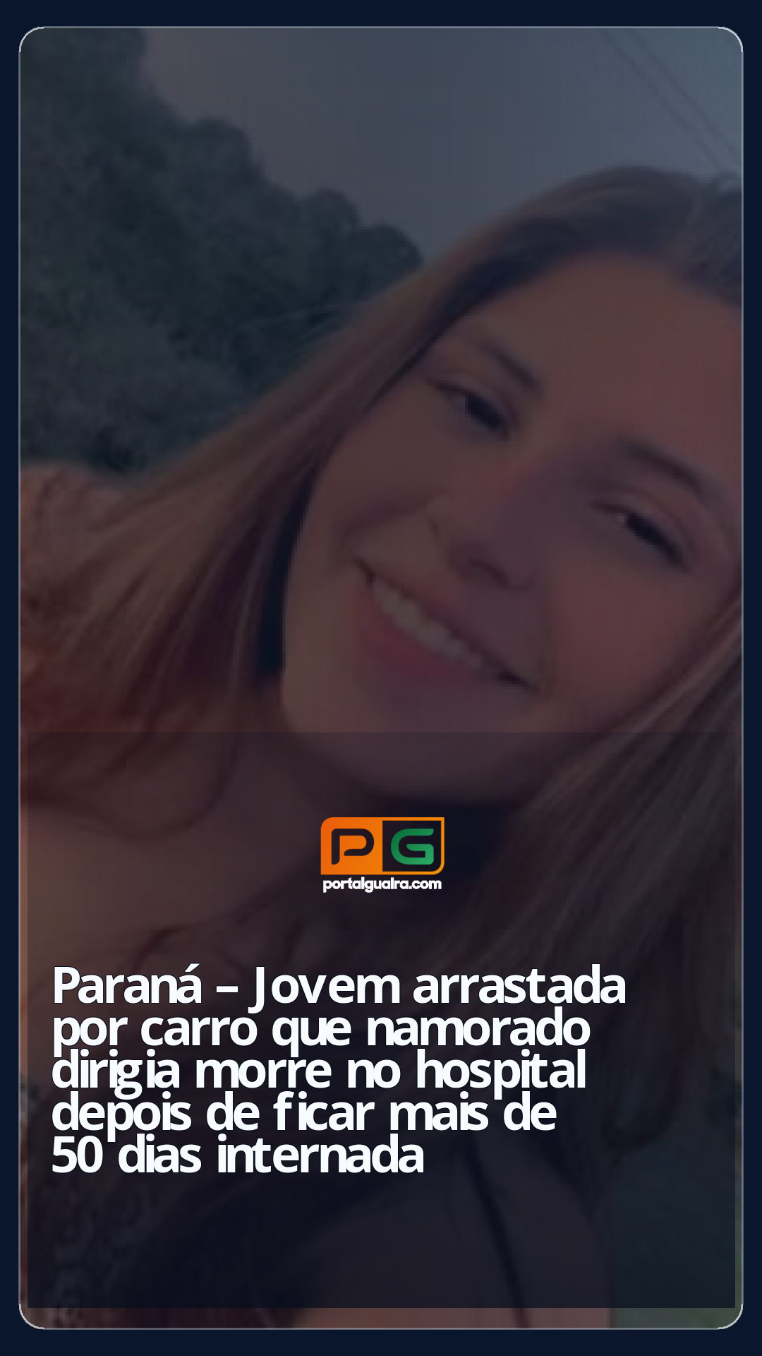 Ana Carolina de Souza, de 19 anos, teve a morte confirmada na madrugada de segunda-feira (12). Ela ficou 57 dias internada depois de ser arrastada por aproximadamente 120 metros pelo carro que o companheiro dirigia, em Apucarana, no norte do Paraná. Caso aconteceu no dia 15 de março.