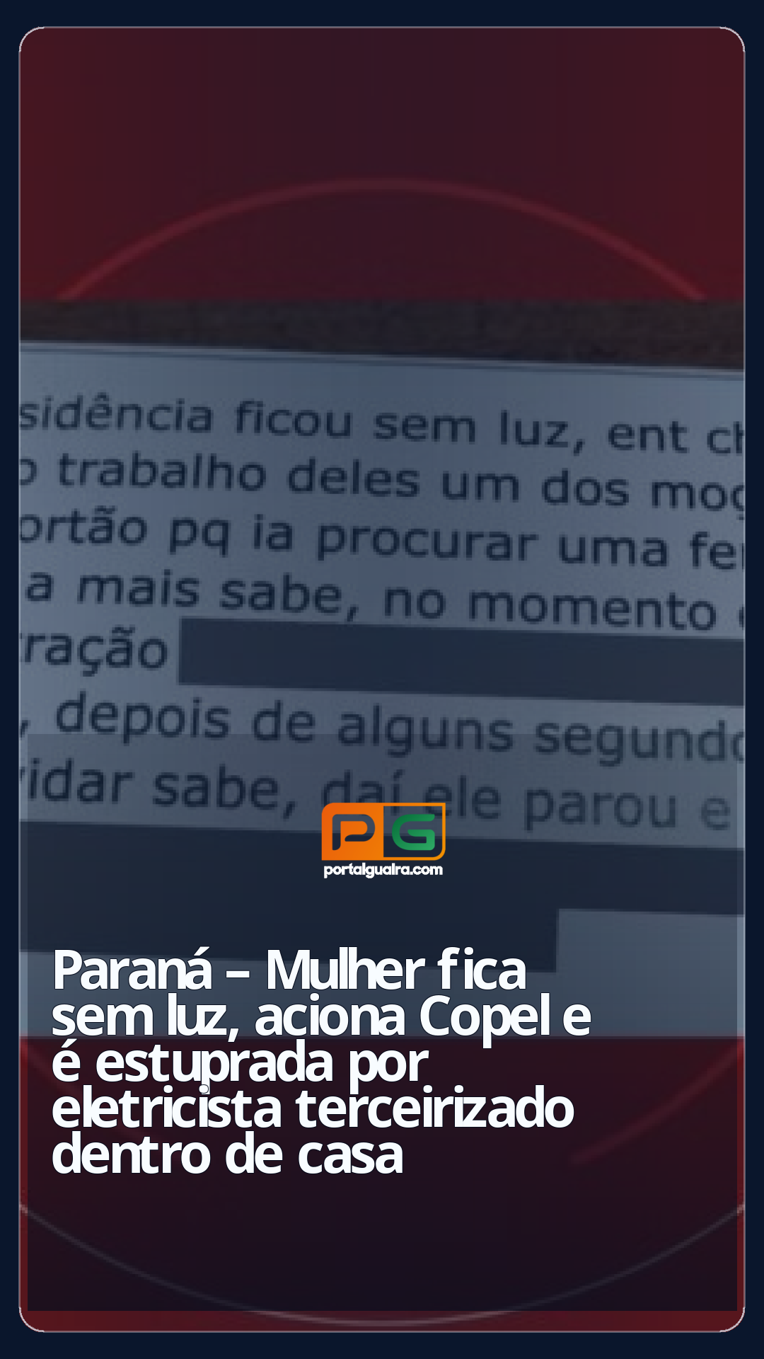 Uma mulher foi estuprada por um eletricista terceirizado da Companhia Paranaense de Energia (Copel) dentro da própria casa, após acionar a concessionária por estar sem luz em casa. As informações são da delegada Cláudia Krüger, que explica que dois prestadores de serviço foram até a residência prestar atendimento ao chamado.